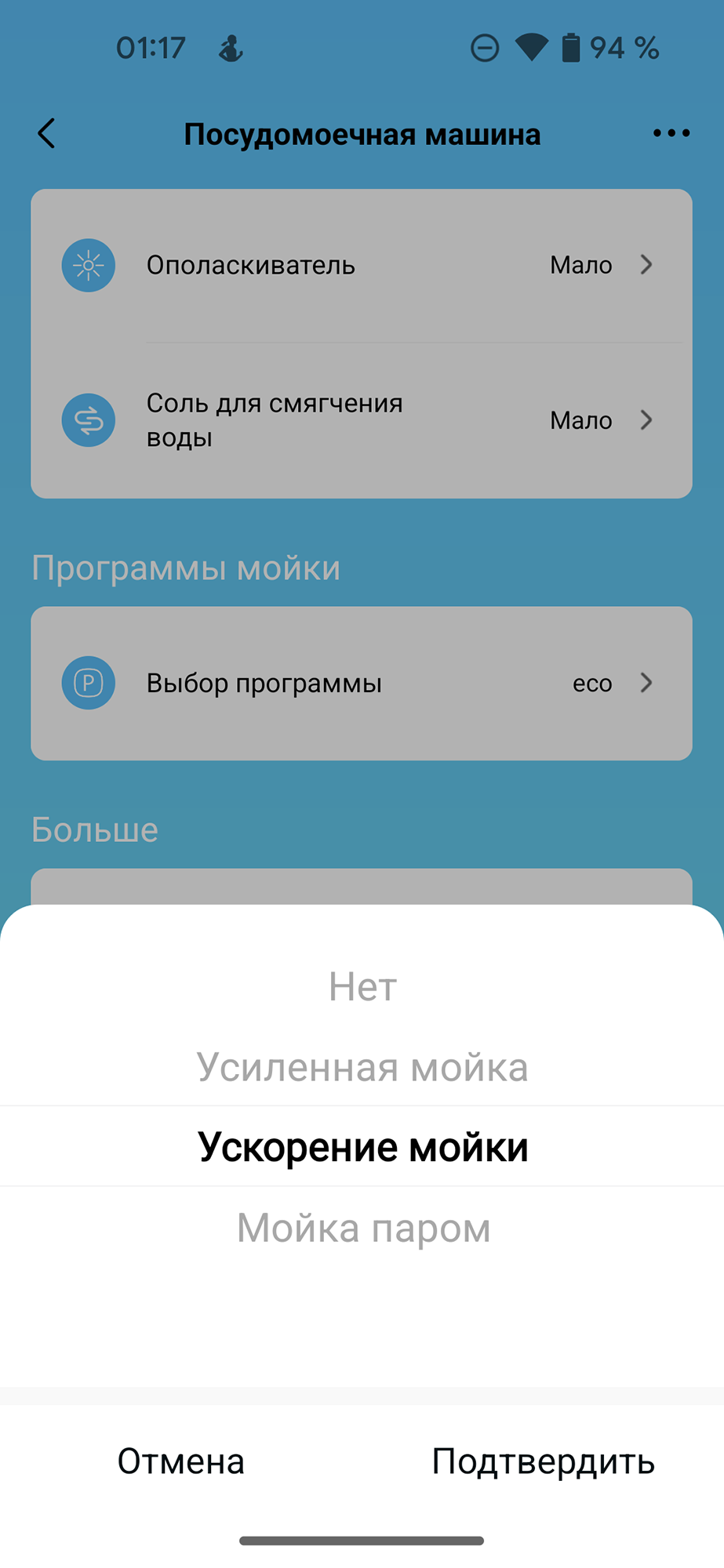 Кнопка «Еще» позволяет управлять временем и интенсивностью мытья: стандартный сценарий можно, в зависимости от уровня загрязнения посуды, ускорить или замедлить. Здесь же можно включить режим мойки паром.
