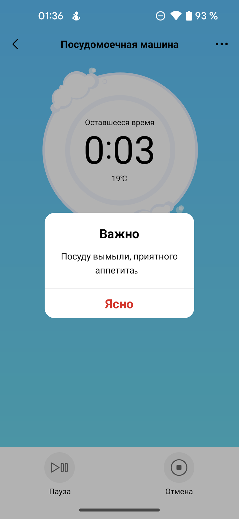 Во время выполнения сценария приложение показывает время, оставшееся до его окончания, и текущий этап мытья. Приостановить или прервать программу можно кнопками в нижней части экрана.