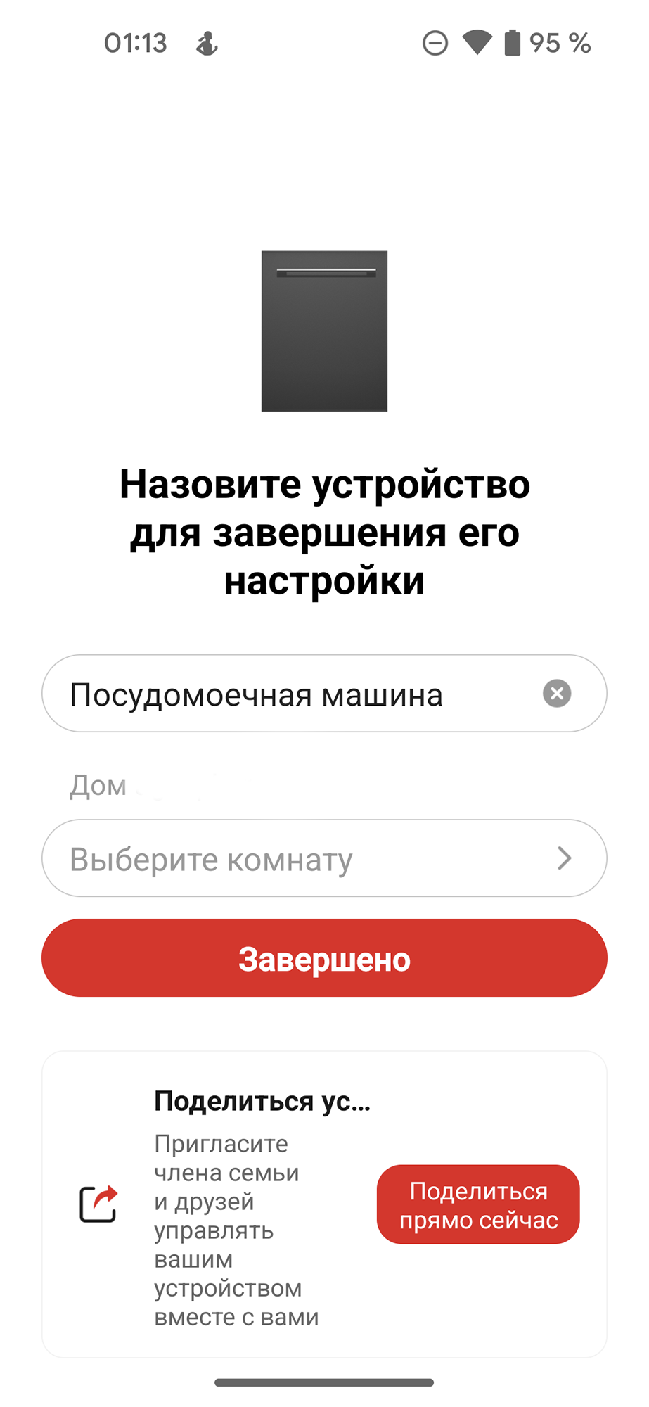 Последнее, что остается сделать после удачного сопряжения — дать машине понятное название, выбрать для него помещение и, при желании, поделиться правами на устройство с домочадцами.