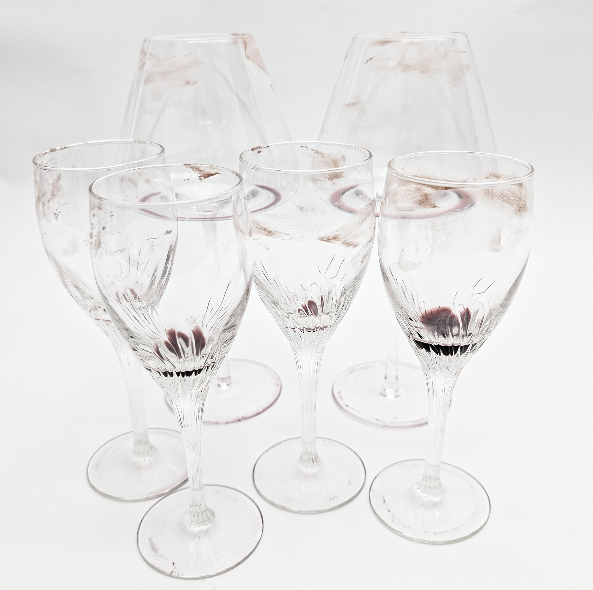 Несколько тонких стеклянных бокалов испачкали жирной губной помадой и красным вином, имитировав последствия веселой вечеринки. Как и в предыдущих тестах, посуду оставили высыхать в течение суток.