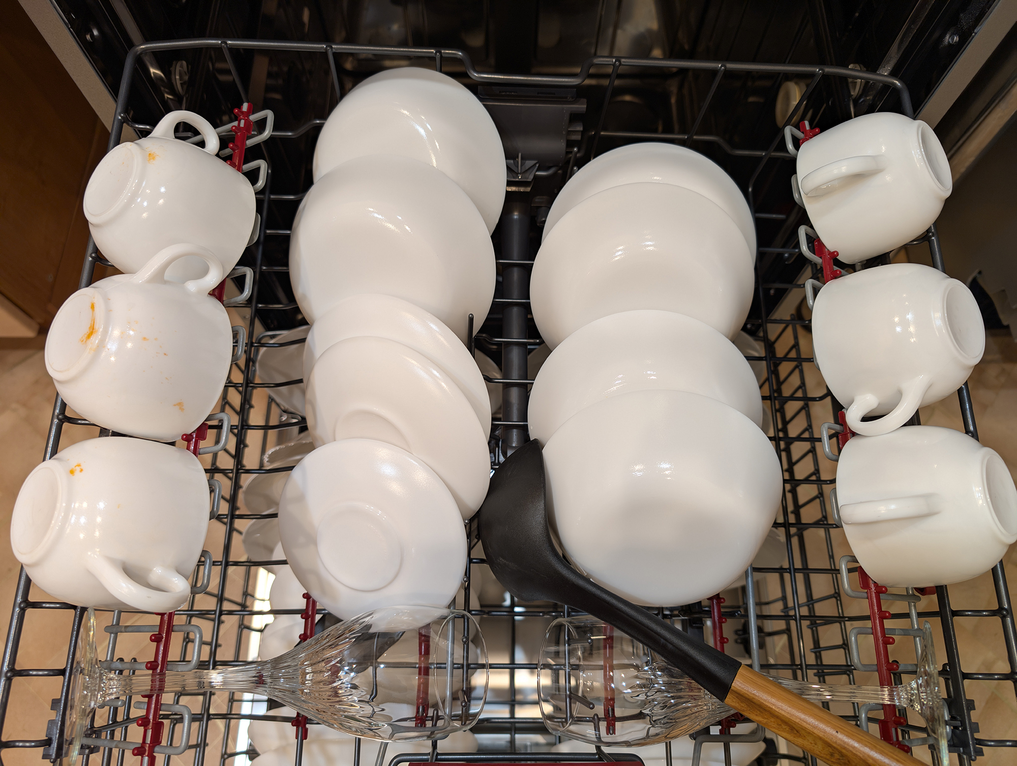 Небольшой огрех, впрочем, нашелся: на донцах чашек, размещенных на левой откидной полке средней корзины, остались незначительные следы нашей смеси.
