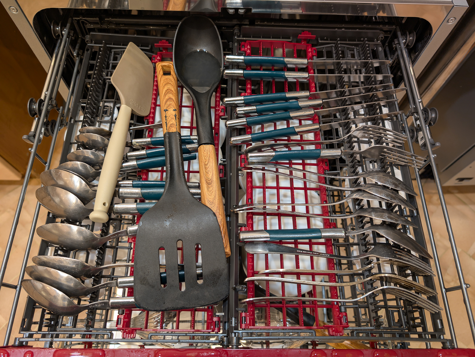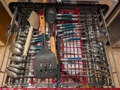 Приглядевшись, мы поняли, что в недостаточно тщательной промывке виноваты сами: хотя средняя корзина, оставленная в верхнем положении, задвигалась без проблем и не зацепляла посудой за верхнюю полку, небольшое расстояние между приборами не позволяло эффективно промыть фарфор. В данном случае следовало опустить корзину в нижнее положение.