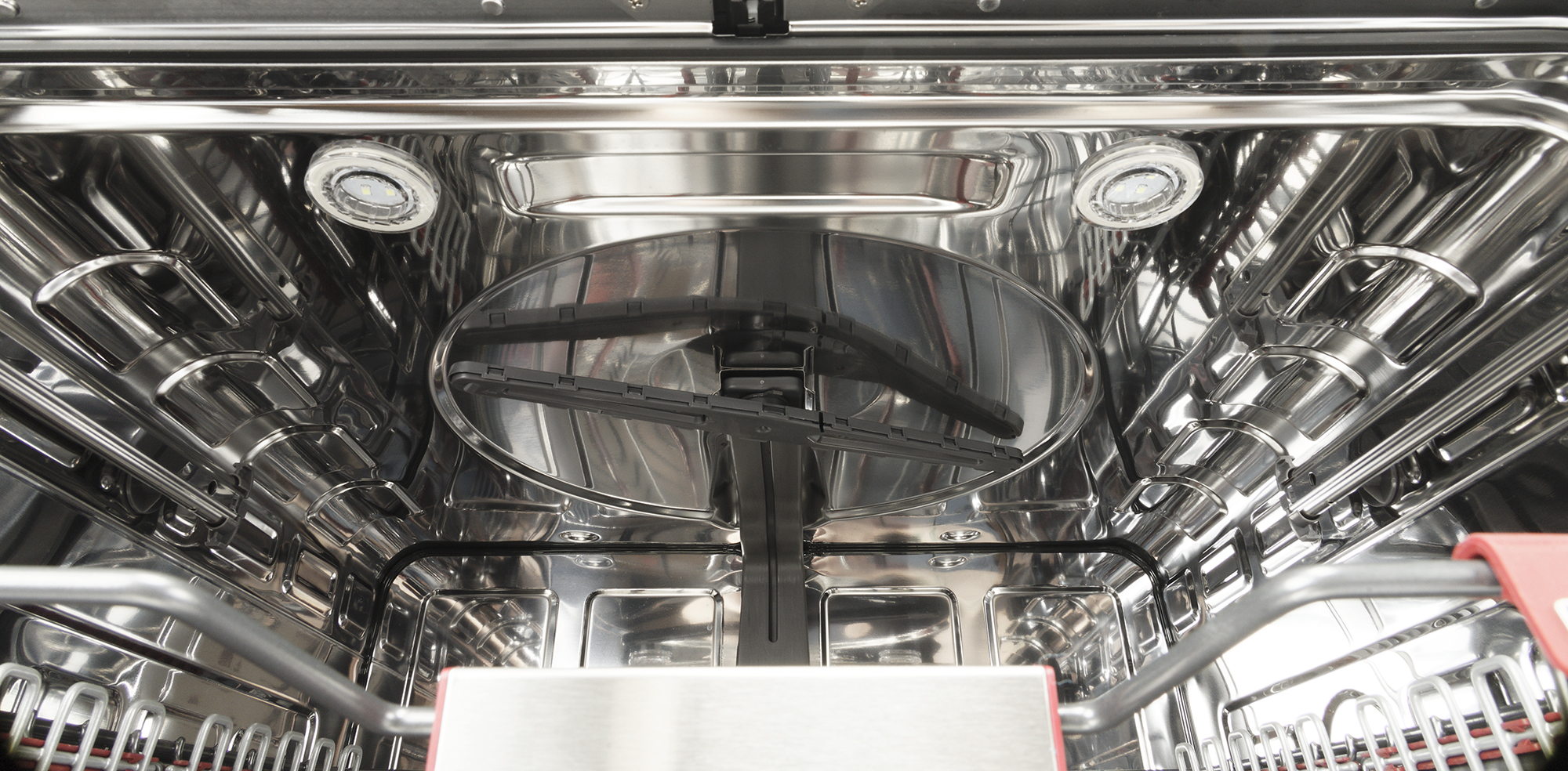 Второй разбрызгиватель интегрирован в конструкцию средней корзины — его мы видели на одном из предыдущих фото. Для мытья столовых приборов на полке предназначен полноценный верхний разбрызгиватель: традиционное вращающееся «коромысло», как показывает практика, оказывается эффективнее потолочных форсунок, которые мы встречали у многих других трехполочных моделей. Toshiba DW-16B1(B)-RU оснащена внутренней подсветкой: два круглых светодиодных плафона размещены в верхней части емкости, а третий расположен на правой стенке. Согласно информации от производителя, в светильниках использованы светодиоды обычного и ультрафиолетового спектров: УФ-обработка способствует дополнительной стерилизации посуды и предотвращает развитие бактерий.