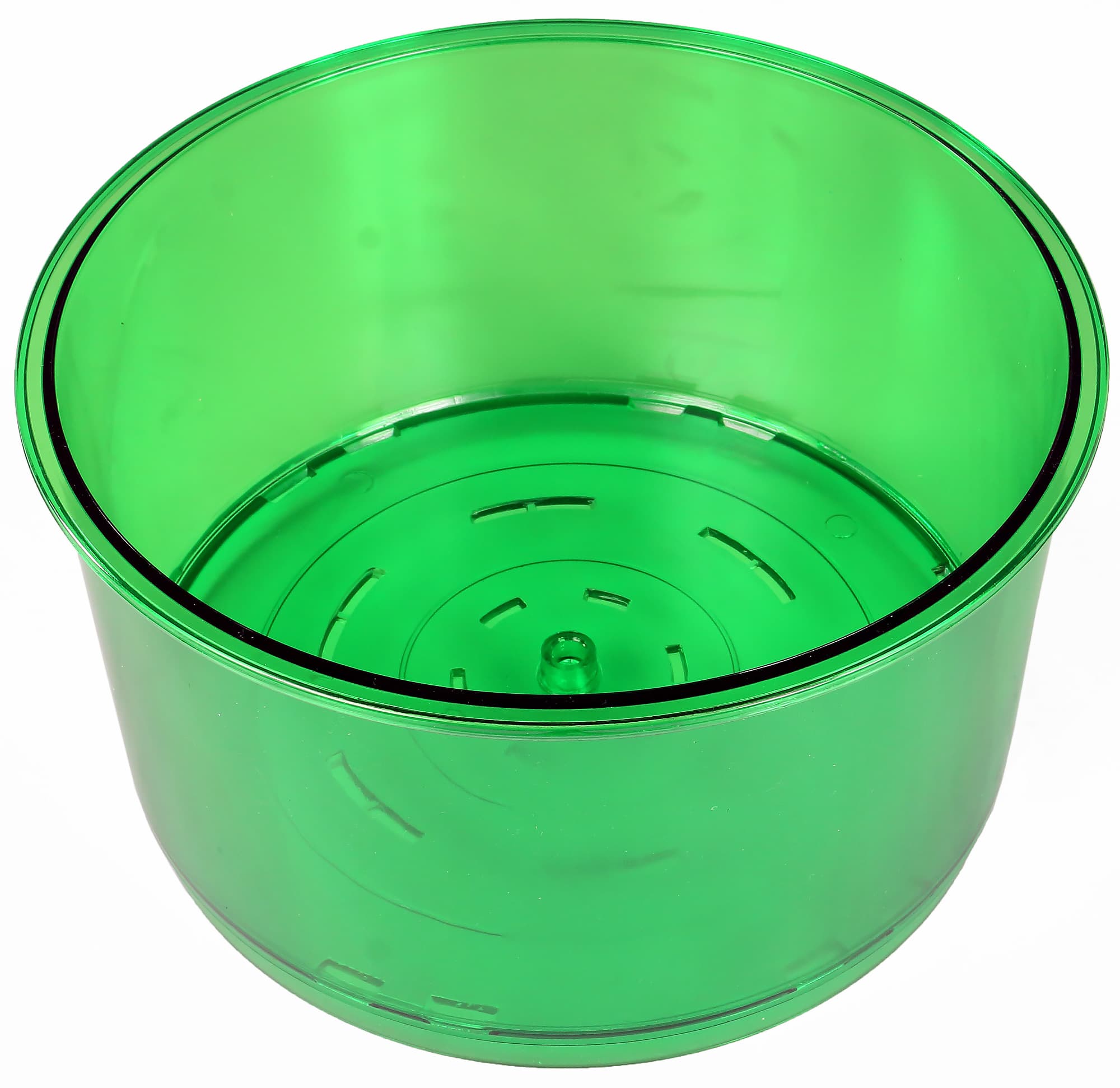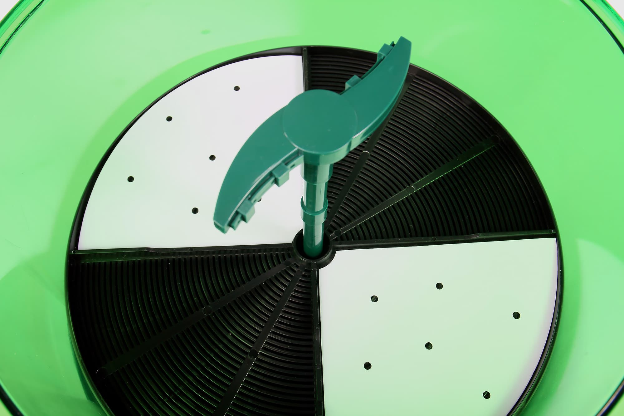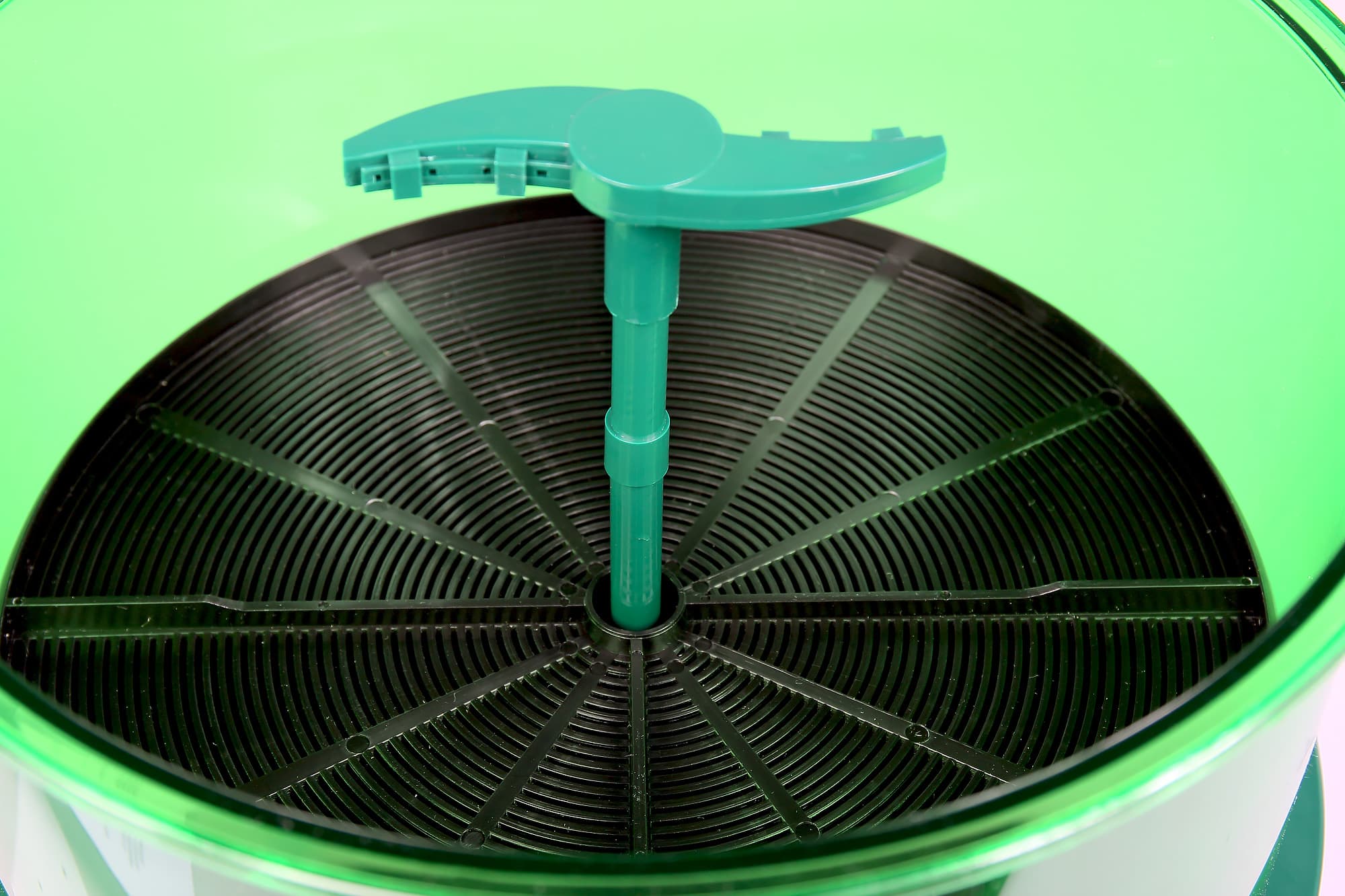 Затем можно собирать второй этаж конструкции. На резервуар с водой устанавливается контейнер для проращивания. Дно этого полупрозрачного цилиндра перфорировано: через эти отверстия во время полива будет стекать вода. Потом в установленный цилиндр ставится трубка полива. Внутрь лотка помещаются два диска: на нижнем из них располагаются зерна, верхний прикрывает нижний.