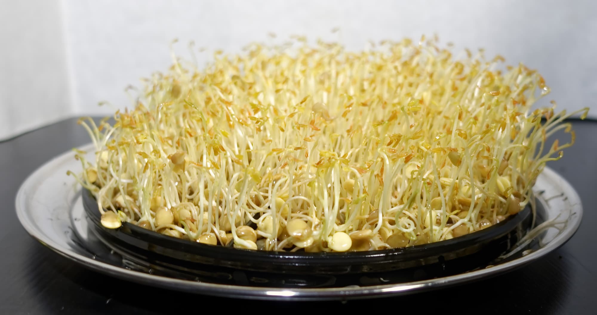 В случае с чечевицей ничего не изменилось: она опять буйно проросла в обе стороны. Верхний диск толстые кудрявые ростки просто постепенно поднимали головами в согласии с ростом урожая.
