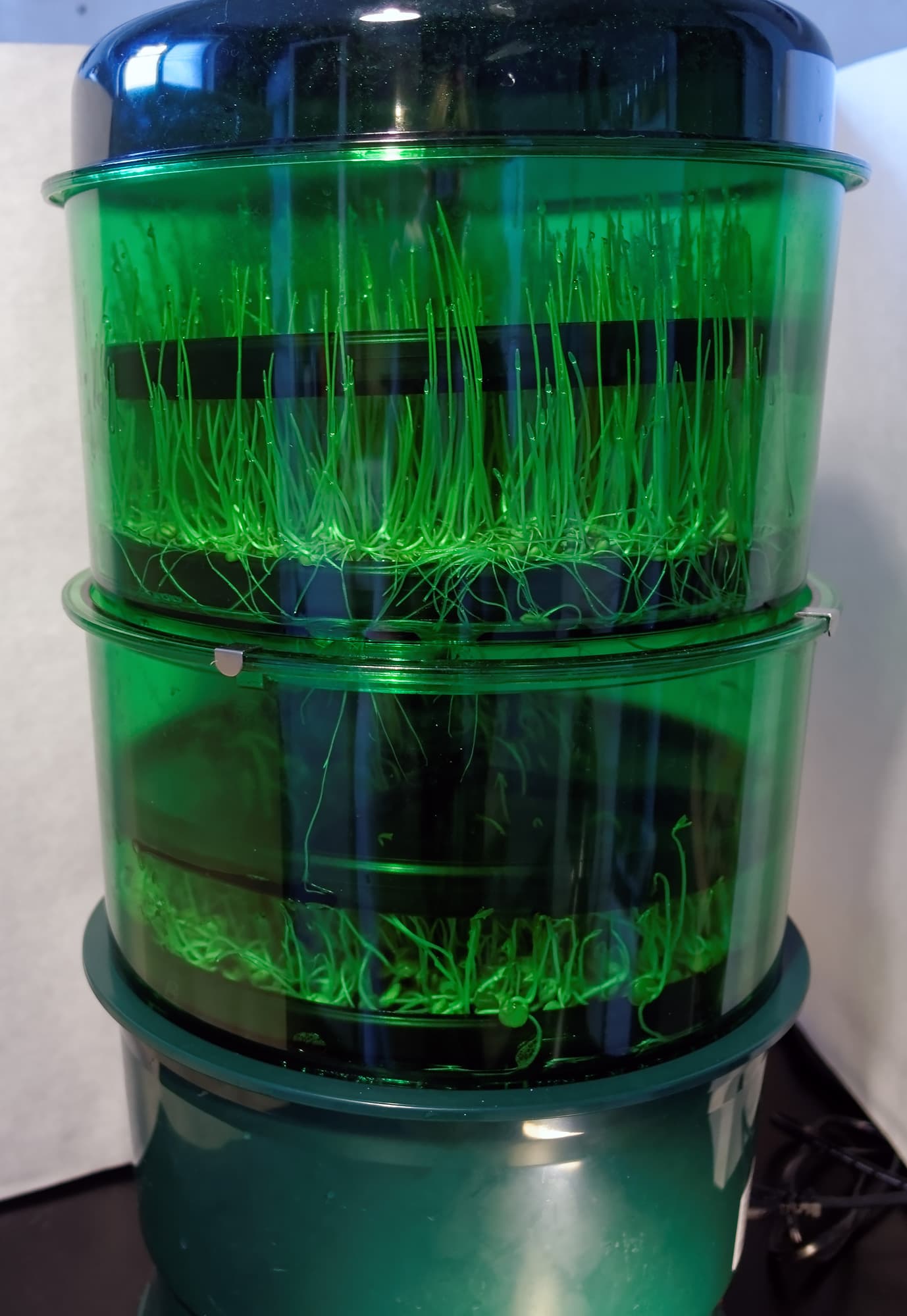 В изначальной конструкции прибора (согласно руководству) на этом этажи и заканчиваются: дальше следует надеть на трубку полива разбрызгиватель, а затем водрузить сверху прибора крышку. Но спраутер Tribest Freshlife 3000 подразумевает возможность наращивания объемов производства путем увеличения высотности конструкции. Проще говоря, мы можем поставить сверху еще один или два цилиндра для проращивания. В нашем распоряжении оказался один бонусный цилиндр.