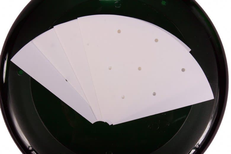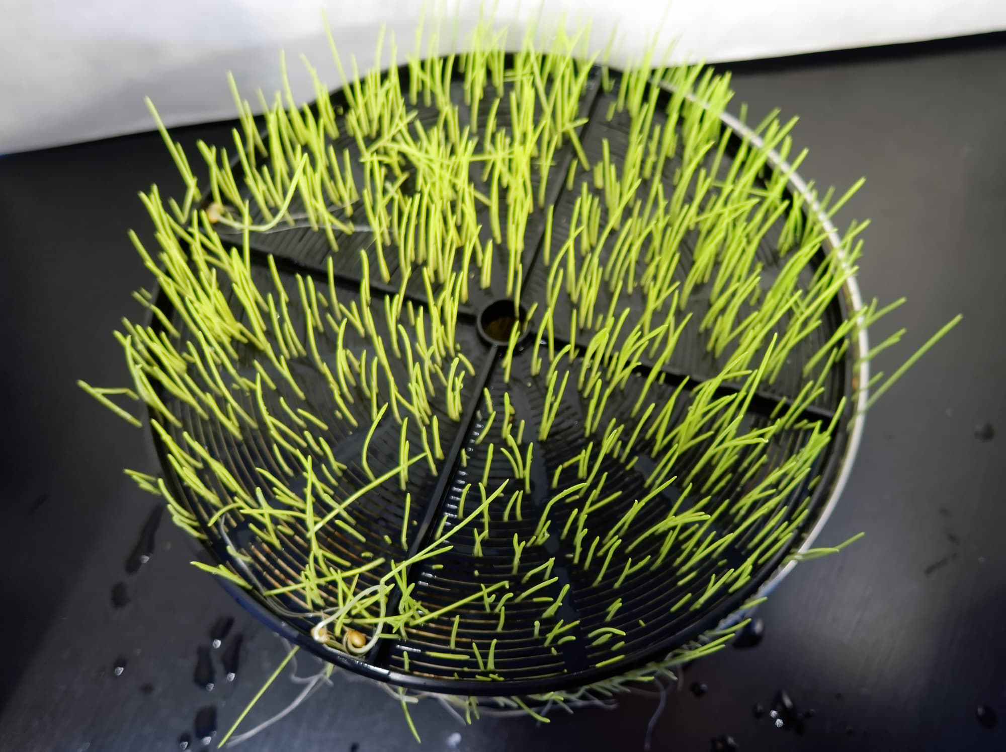 Во втором опыте мы поменяли сырье этажами и запустили процесс заново. На этот раз мы тщательно распределили зерна пшеницы по диску в один слой. На дно лотка под зерна пшеницы мы положили специальную подкладку для корней.