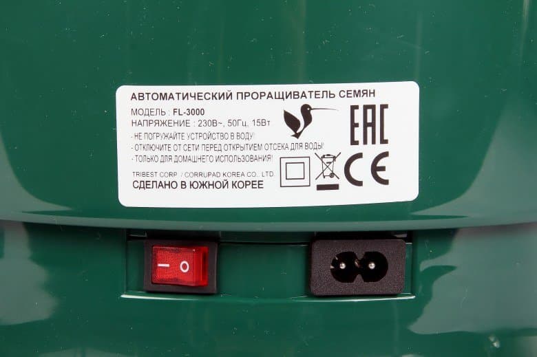 Прибор продолжает цикл работы до тех пор, пока пользователь не отключит его. Это в среднем от трех до шести дней, в зависимости от желаемого результата и вида зерен. Продолжительность полива — три минуты, промежутки между поливами — 15 минут.