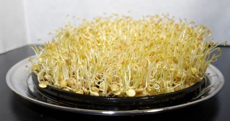 В первом опыте мы расположили пшеницу нижним этажом, а чечевицу верхним. Через пару дней и то, и другое проросло, еще через три — дало густую поросль заметных, довольно высоких ростков.