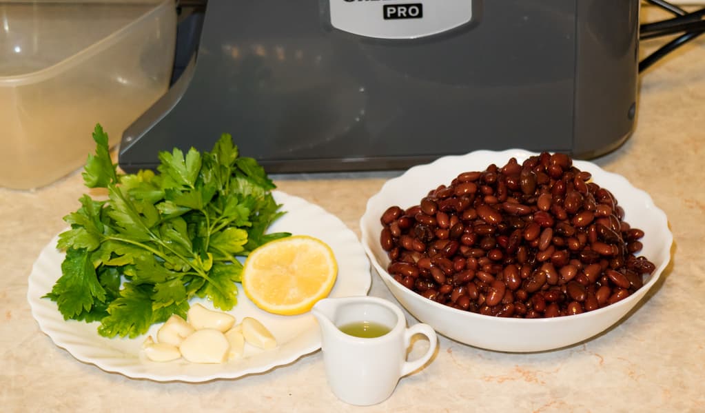 Собрали прибор для функции измельчения: вставили насадку для гомогенизации с отверстием для выхода продукта, закрутили стандартный регулятор до упора. Отварную фасоль с небольшим количеством отвара, чеснок, лимон и свежую зелень петрушки поочередно закладывали в загрузочное отверстие соковыжималки. Периодически слегка нажимали толкателем.