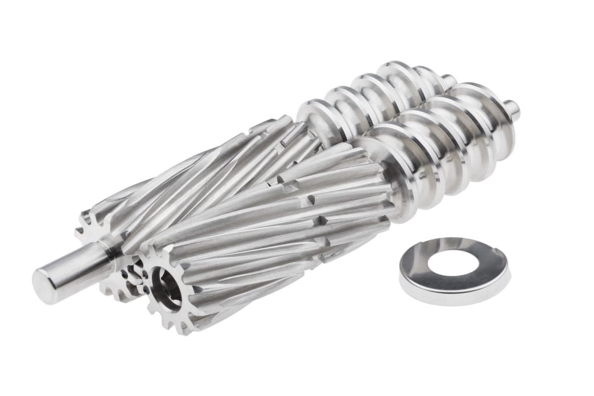 Фактическая информация: шнеки стальные, весят 1,18 кг. Длина рабочей части — 14 см, диаметр в максимальной части 32 мм. Перепутать ведущий и ведомый шнек невозможно, поэтому сборка осуществляется просто. Совмещаются точки на шнеках, затем обе детали вставляются в корпус торцевой частью до упора. При этом вал ведомого шнека вставляется в углубление, а ведущий шнек закрепляется на приводном вале.