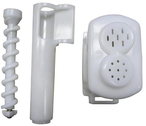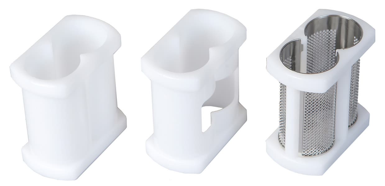 Затем на корпус с установленными шнеками надевается корпус для шнеков с воронкой для загрузки ингредиентов. На открытую часть шнеков следует надеть сетку или насадку. В комплект входит две сетки и две насадки. Форма их одинакова. Сетки изготовлены из нержавеющей стали и ультрапрочного пластика Ultem. Отличаются диаметром отверстий. Сетка с мелкими отверстиями предназначена для отжима осветленного сока, с крупными — для сока с мякотью. Насадки сделаны из ультрапрочного пластика. Одна из них сплошная, вторая — с отверстием для выхода продуктов.