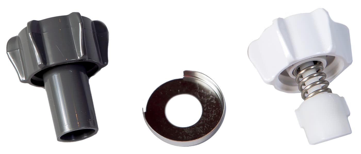 Регуляторы отжима контролируют, насколько мякоть сжимается перед тем, как выйти из отверстия выхода жмыха. Затягивание регулятора повышает давление на продукт во время отжима. Выбор регулятора жмыха производится в зависимости от обрабатываемого сырья и насадки. Так, стандартный регулятор применяется только с сетками и предназначен для отжима сока из твердых овощей и фруктов. Регулятор для мягких фруктов и овощей применяется при отжиме сока из, соответственно, мягких фруктов. Деталь имеет более мягкую пружину, что позволяет жмыху выходить легче. Регулятор-носик (для хлебных палочек) применяется с закрытой насадкой и нужен при изготовлении паст, щербета и других блюд с однородной консистенцией.