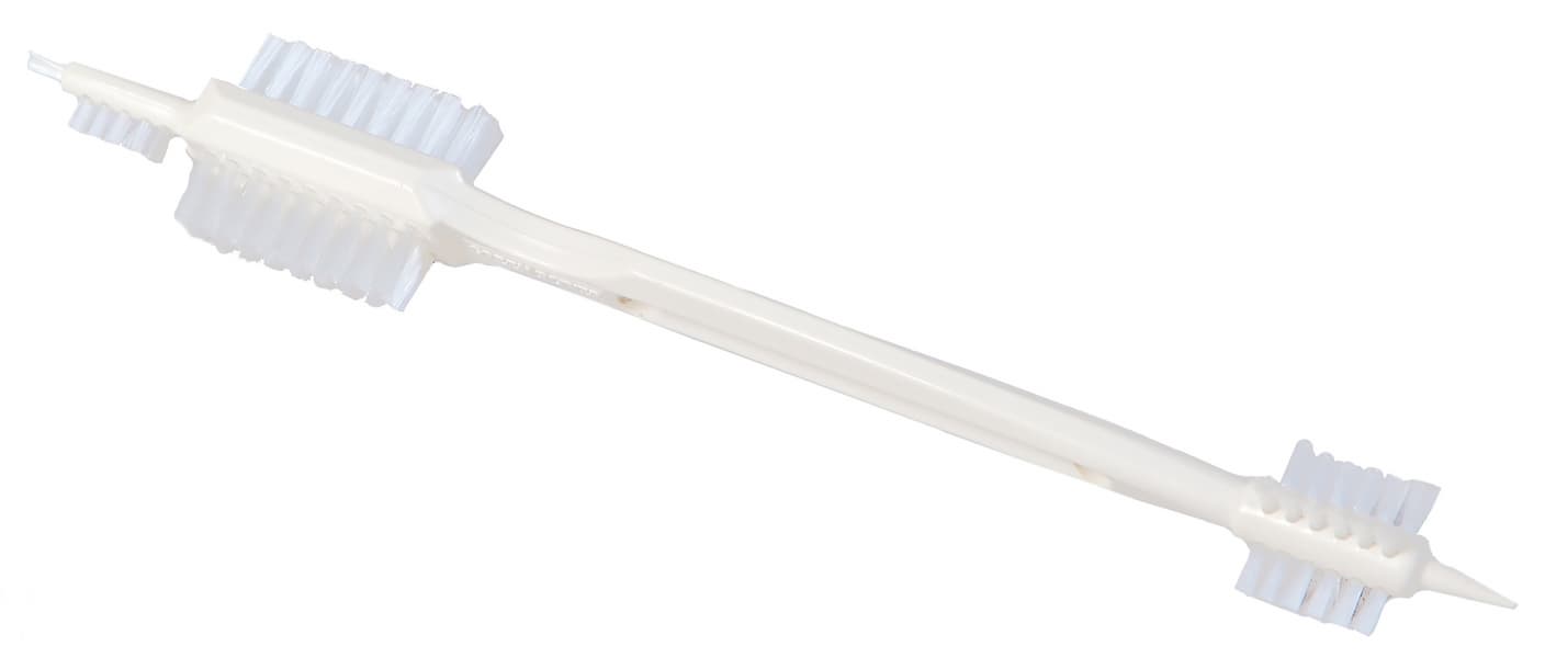Из нужных аксессуаров следует отметить две щетки для очистки — большую и малую, а также специальный скребок. Большая щетка белого цвета с жесткой щетиной разной длины и направленности поможет добраться до самых потаенных мест соковыжималки. Малая черного цвета со съемными насадками поможет очистить сетки для отжима сока. На ручке можно закрепить или скребок, или плоскую щетку с одним рядом длинной жесткой щетины.