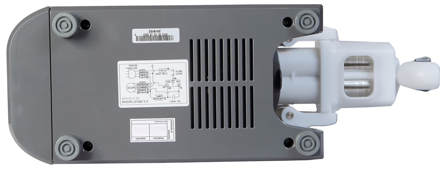 На дне прибора можно увидеть четыре ножки, вентиляционные отверстия и три информационные наклейки. Две «задние» ножки почти в два раза выше, чем те, которые расположены ближе к месту крепления шнеков и насадок. Ножки оснащены мощными резиновыми накладками. Детали съемные, так что при необходимости их можно тщательно очистить. Накладки служат не только для улучшения сцепления с поверхностью стола (с этим, на наш взгляд, прекрасно справляется вес аппарата), но и для противодействия вибрациям, которые могут возникнуть по ходу работы.