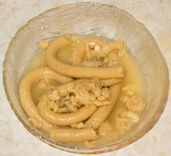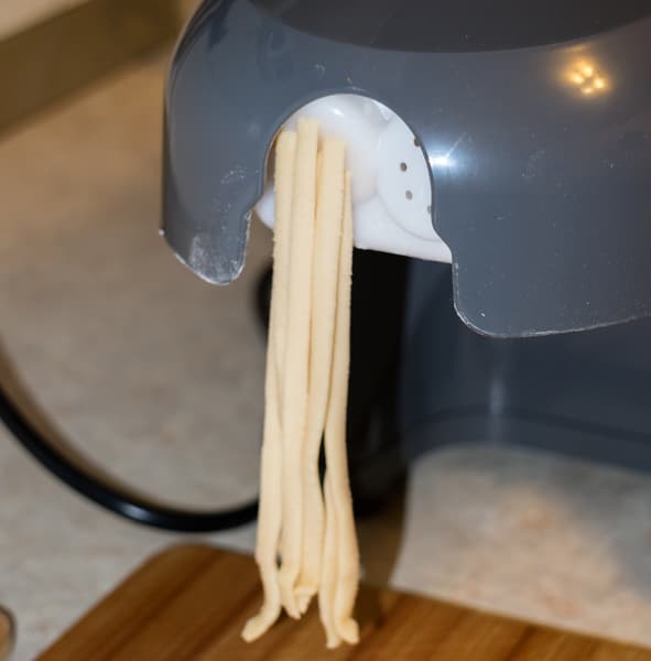 Замесили крутое тесто из яиц и муки, в которую всыпали щепотку соли. По ходу замеса стало ясно, что недостаточно влаги, поэтому влили пару столовых ложек масла. На 40 минут убрали тесто в холодильник. Потом собрали насадку, нарезали тесто на небольшие брусочки, хорошо обваляли их в муке и приступили к изготовлению домашней лапши. Сначала попробовали делать с помощью формы для плоской лапши, затем — для круглых спагетти.
