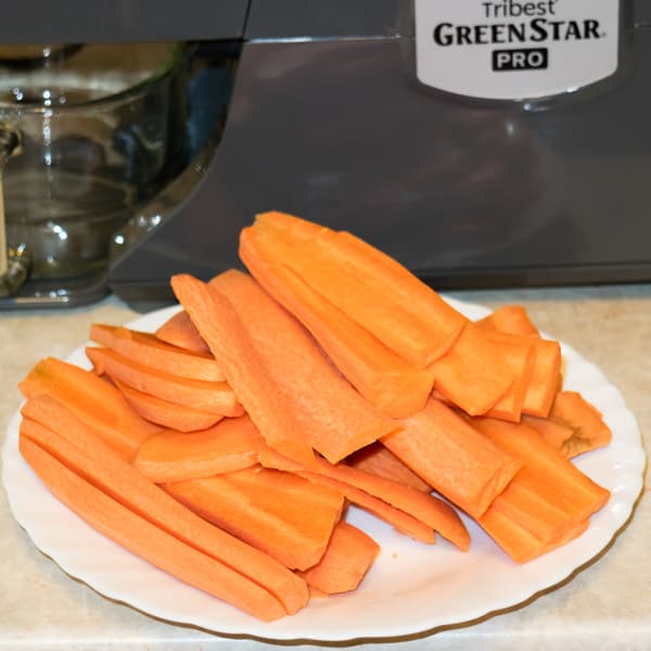 Один килограмм очищенной моркови нарезали вдоль на четыре или пять полосок. Для отжима использовали насадку с мелкоячеистой сеткой. Стандартный регулятор выхода жмыха закрутили до упора.