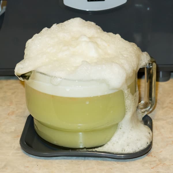 В результате получили чистый сок без мякоти, со специфическим запахом и вкусом. Пены было много.