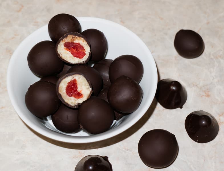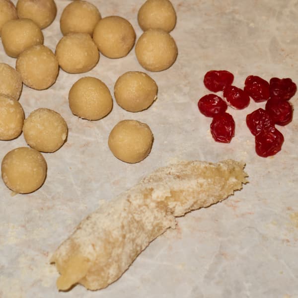 Затем извлекли из кастрюли и остудили. Взяли вяленую вишню, каждую ягоду обернули в шарик марципана. Полученные шарики начинки нанизали на зубочистки.