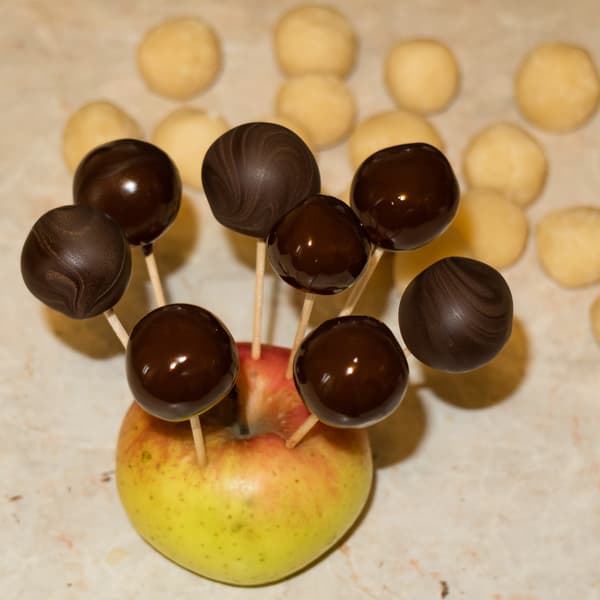 Параллельно растопили плитку горького шоколада: поломали шоколад в чашку, которую поместили в горячую воду. Хорошо перемешивали, чтобы температура массы была однородной. Затем обмакивали каждый шарик начинки в жидкий шоколад и втыкали зубочистку с конфетой в яблоко.