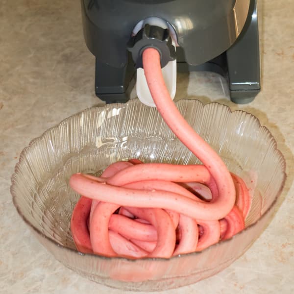 Собрали насадку для изготовления хлебных палочек: надели на шнеки сплошную насадку без отверстия для выхода сока и закрепили регулятор с отверстием. Включили соковыжималку и начали поочередно подавать на шнеки клубнику и банан. В самом начале масса шла мягкой и почти жидкой, видимо, продукты подтаивали в соприкосновении с деталями соковыжималки, которые имели комнатную температуру. Довольно быстро сорбет «пошел» единой гибкой колбаской.