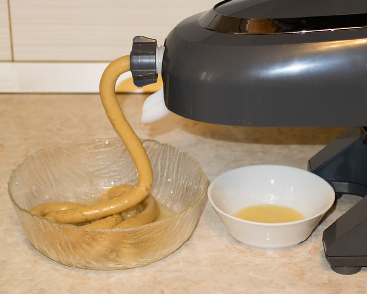 Миндаль был очищен, затем замочен в холодной кипяченой воде на 6 часов. Слили большую часть воды, собрали прибор, закрепив насадку без отверстий и регулятор для хлебных палочек. Включили прибор и начали неспешно подавать в загрузочное отверстие орехи и по чуть-чуть воды. Вначале ничего не происходило, затем из камеры для шнеков и насадки потекло. Как оказалось, потекла эмульсия масла с водой.