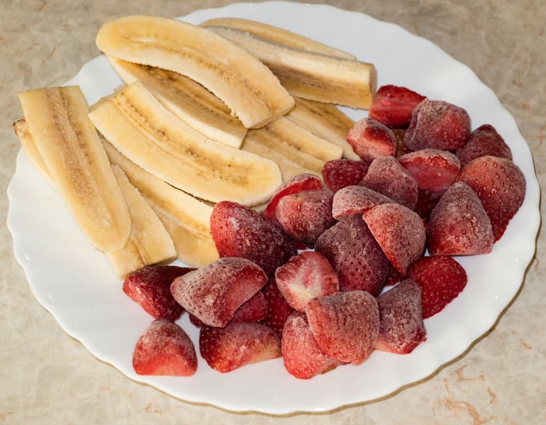 Предварительно нарезали банан на четыре части и заморозили. Замороженную клубнику перед обработкой разрезали напополам.