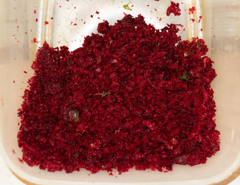 Две свеклы очистили от кожуры и нарезали на длинные тонкие ломти. Вес сырья составил 620 г. Отжимали с использованием сетки с мелкими отверстиями и ослабленным буквально на четверть регулятором жмыха.