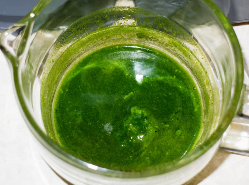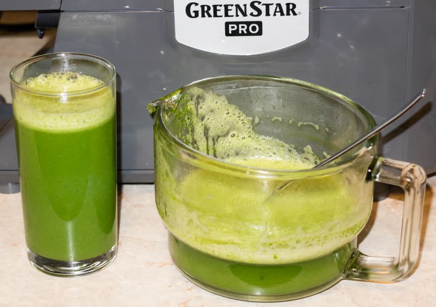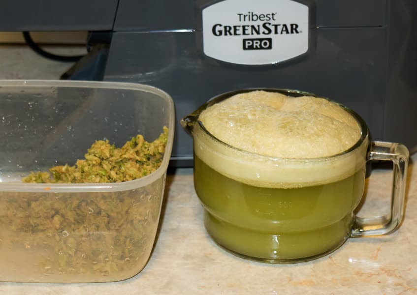 Сока выделилось в сравнении с другими тестами не так много — всего 33 г. Сок получился густой, ярко-зеленый. Жмых представлял собой сильно спрессованные травянистые волокна.