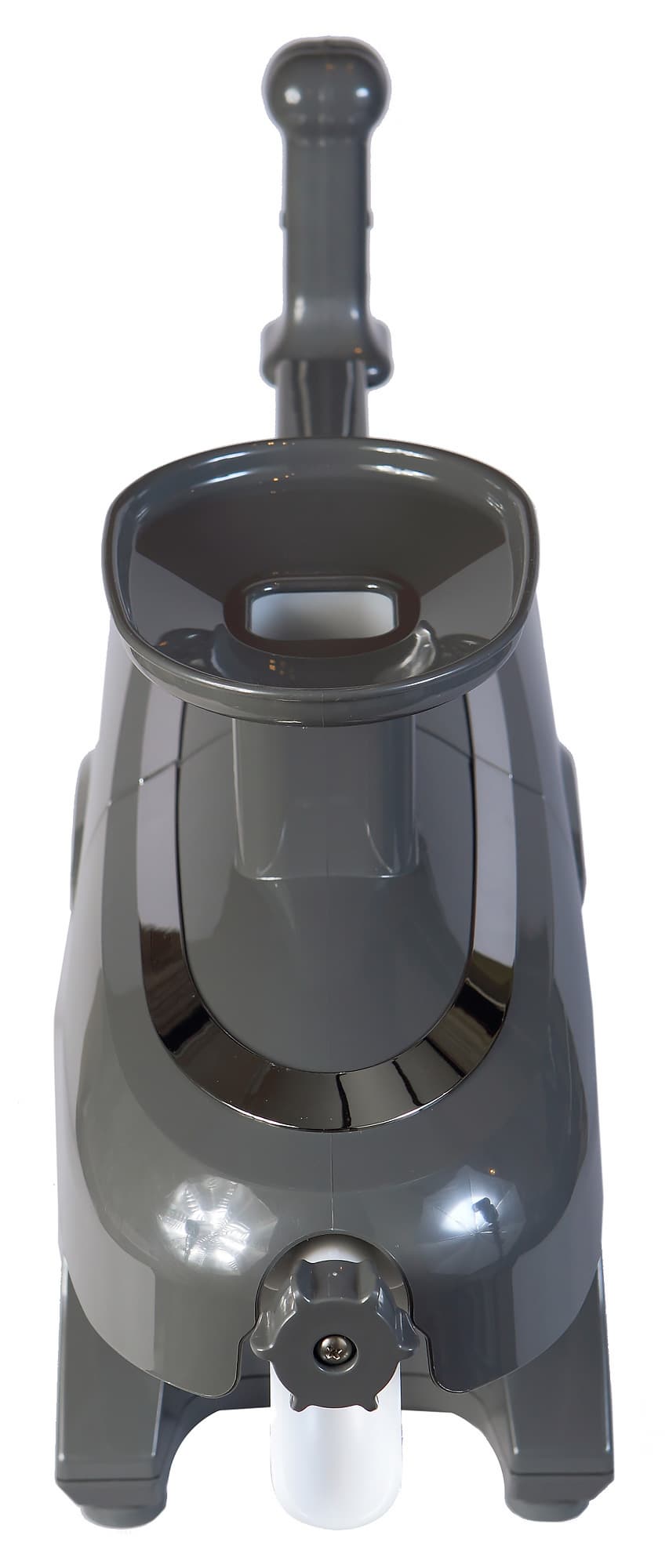 Прибор впечатляет своим размером, весом и подчеркнуто неярким дизайном, который соответствует стилистике техники для профессиональной кухни. Соковыжималка оформлена в неброском сером цвете. Для удобства переноски моторный блок оснащен ручкой. Ручка большая и удобно располагается как в женской, так и в широкой мужской ладони. Вес моторного блока внушителен и составляет 6,4 кг, так что мы порадовались тому, что конструкторы продумали способ перемещения аппарата. В верхней части корпуса рядом с ручкой размещен переключатель, который запускает и отключает работу прибора. Переключатель контрастного красного цвета выделяется и отлично виден с любого ракурса. Внешний вид его опять отсылает нас к образцам промышленного дизайна. Рядом находится индикатор питания.