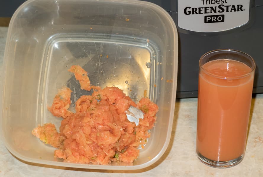 Жмых появился примерно спустя первую треть теста. Консистенция его абсолютно сухая, рассыпчатая. Сок жидкий, насыщенного вкуса и цвета. Через некоторое время на дне стакана отстоялось небольшое количество мякоти. Это является нормальным для шнековых соковыжималок.