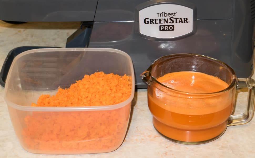 Средний результат Tribest GreenStar Pro GS-P502 по эффективности и скорости отжима сока по четырем тестам равен 727 г / 00:07:36