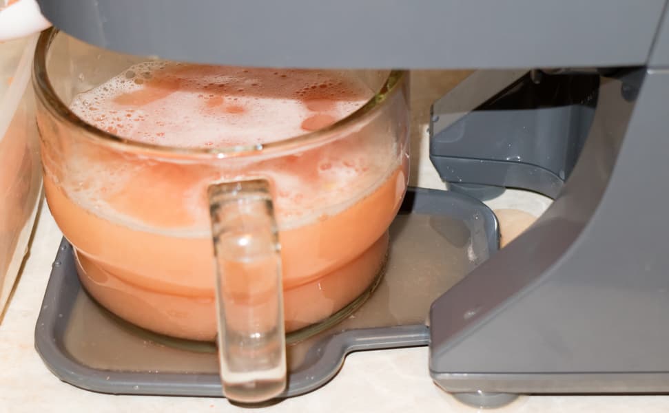 После всех стандартных тестов, мы очистили соковыжималку и повторили тест с грейпфрутами, установив сетку с крупными отверстиями. Регулятор для мягких фруктов был вывернут примерно на треть. Опыт прошел значительно успешнее и эффективнее во всех отношениях. Килограмм сырья был отжат за 3 минуты 5 секунд. Вес полученного сока составил 800 г. Консистенция сока лишь слегка гуще. На наш взгляд, это вовсе не является недостатком.