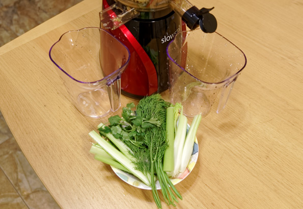 Затем мы взяли черешковый сельдерей, по пучку укропа, петрушки и кинзы и пропустили их через Slowstar с крупным ситом. В сумме 350 граммов волокнистой травы, которую мы нарезали вовсе не такими маленькими кусочками, как в инструкции, а довольно длинными палками. Наша испытуемая справилась за полторы минуты, ни разу не напрягшись и превратив зелень в нежное пюре. Неплохо.