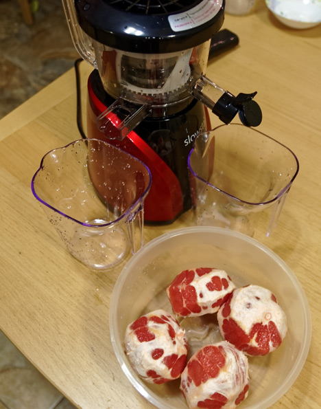Был задействован один килограмм мякоти розового грейпфрута, до взвешивания очищенного от кожуры. Сок лился из прибора, как из крана — впечатлило. За минуту с хвостиком Slowstar SW-2000 справился с заданием, однако внутри оставалась мякоть, так что мы дали ему еще минуту на «добивание остатков».