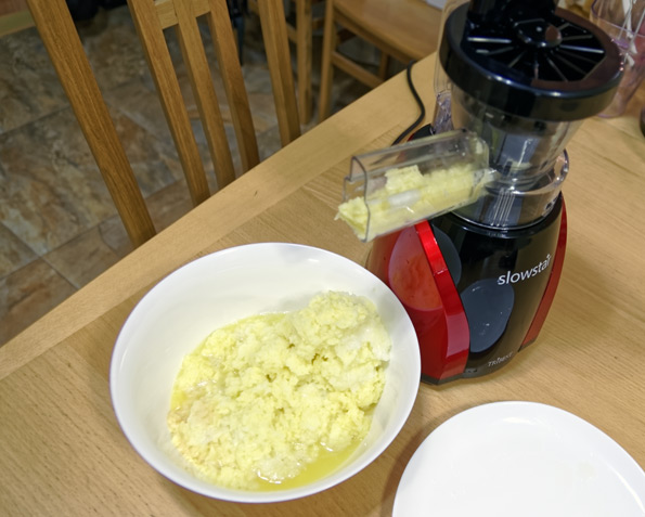 Консистенция действительно оказалась как у драников, но без соприкосновения картошки с металлической теркой (говорят, влияет на вкус, но слепых тестов мы не делали — это уже скорее сфера кулинарного исследования в области драников, чем тестирования Tribest Slowstar SW-2000).