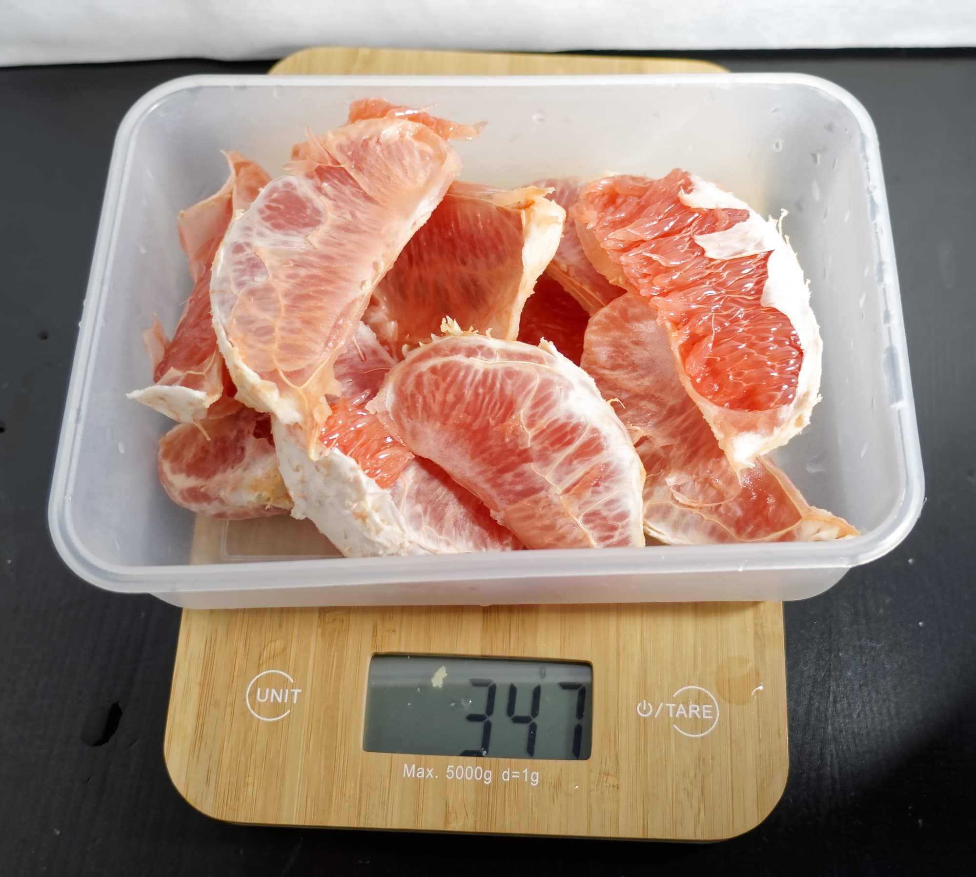Мы взяли привычный нам розовый грейпфрут, обесшкурили и разделили на дольки.