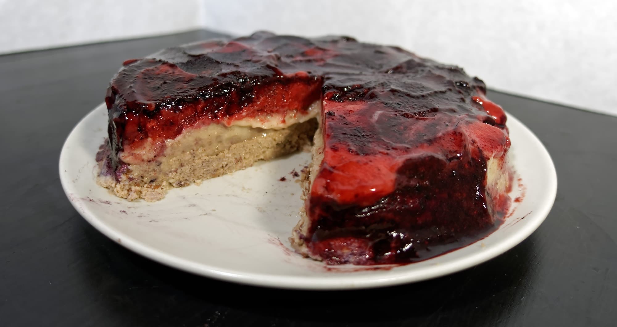 Это отличный десерт для тех, кто не любит торты. Красивый на вид и тающий во рту, без теста и крема, приятно-кислый, с гармонией плотного орехового и сочного фруктового вкусов, с легким шоколадным отзвуком.