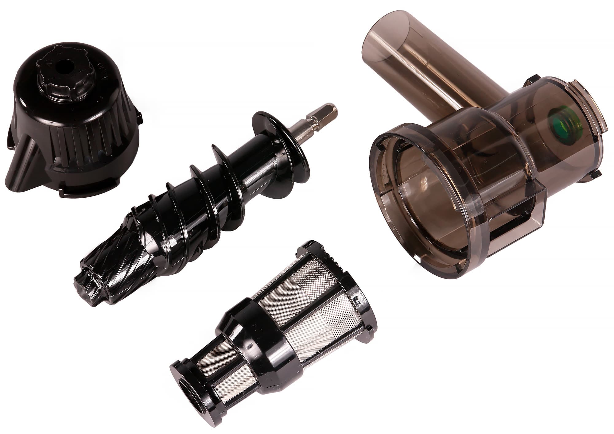 Собирается соковыжималка легко, части встают в пазы без сопротивления, крена и люфта. Прибор очень легкий — что в собранном виде, что в разобранном. Разные части прибора имеют разный окрас: так, основная часть и ручка — серебристые с зеленым, корпус для шнека — черно-прозрачный, оба сита, крышка для насадок и сами насадки — черные, толкатель и щетка — белые.