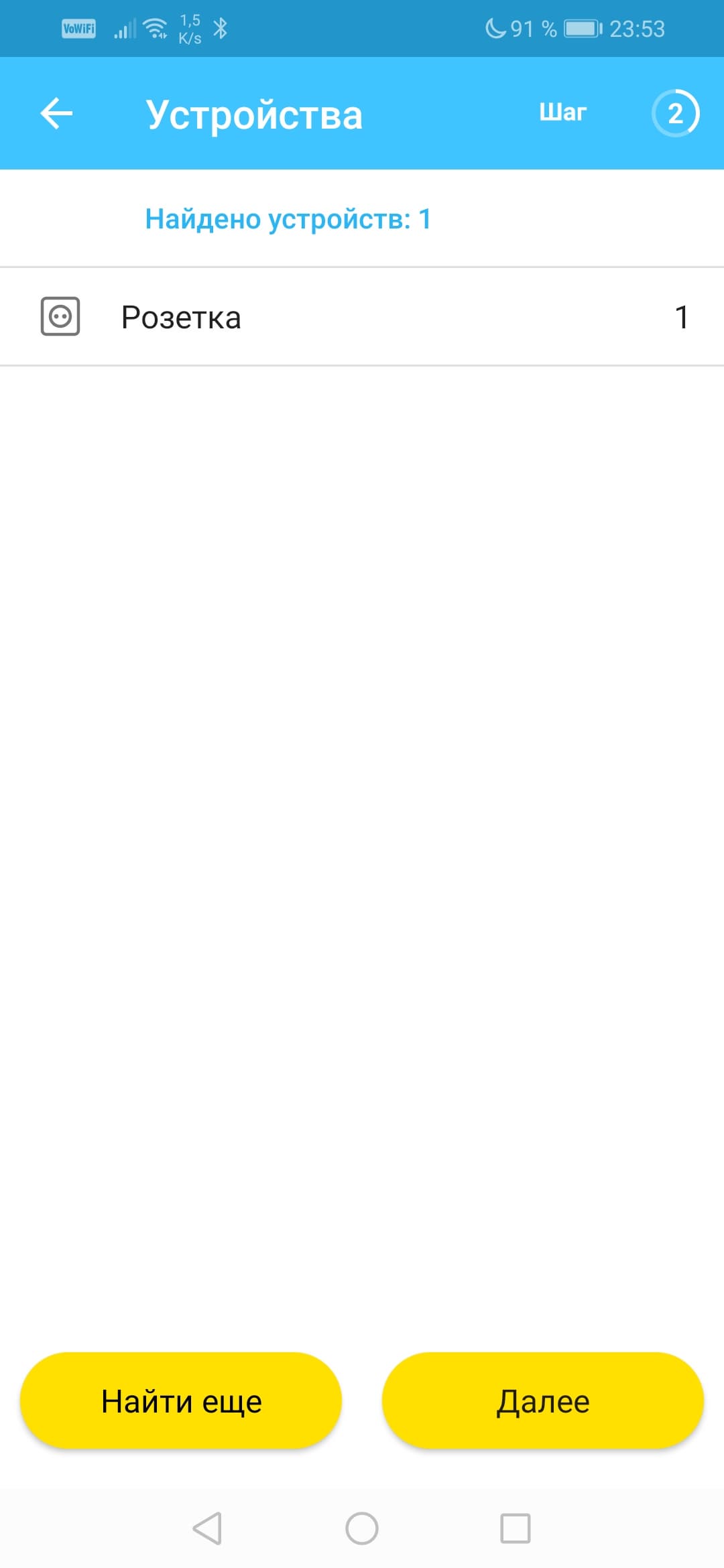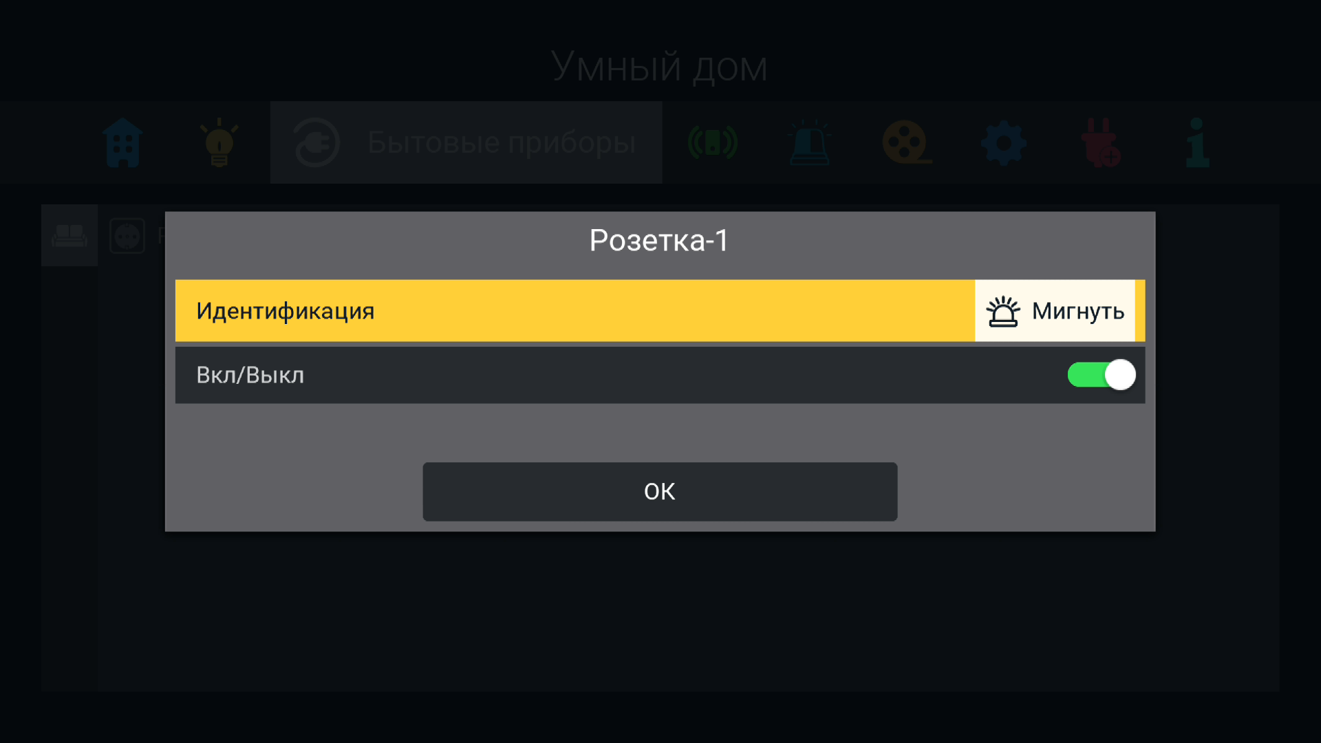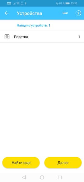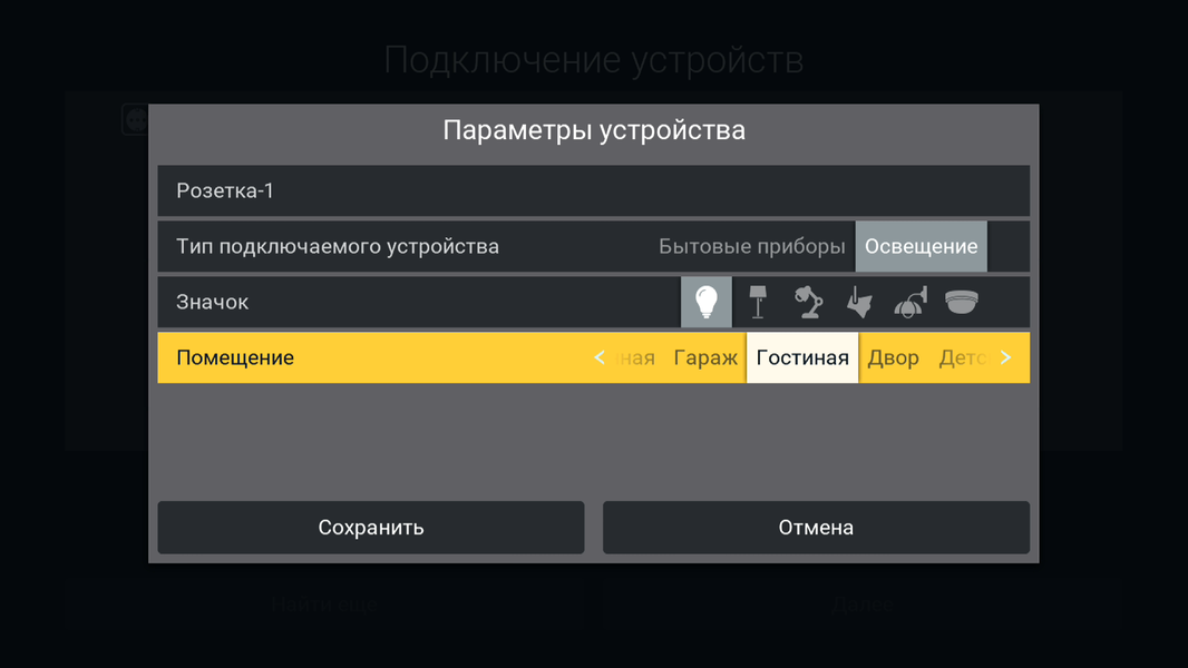 Пусть первым подключаемым устройством будет умная розетка. Модуль управления, отыскав ее сигнал, выведет на экран соответствующую строку. Здесь можно переименовать подключаемое устройство, выбрать помещение, в котором оно расположено и присвоить подходящую пиктограмму.
