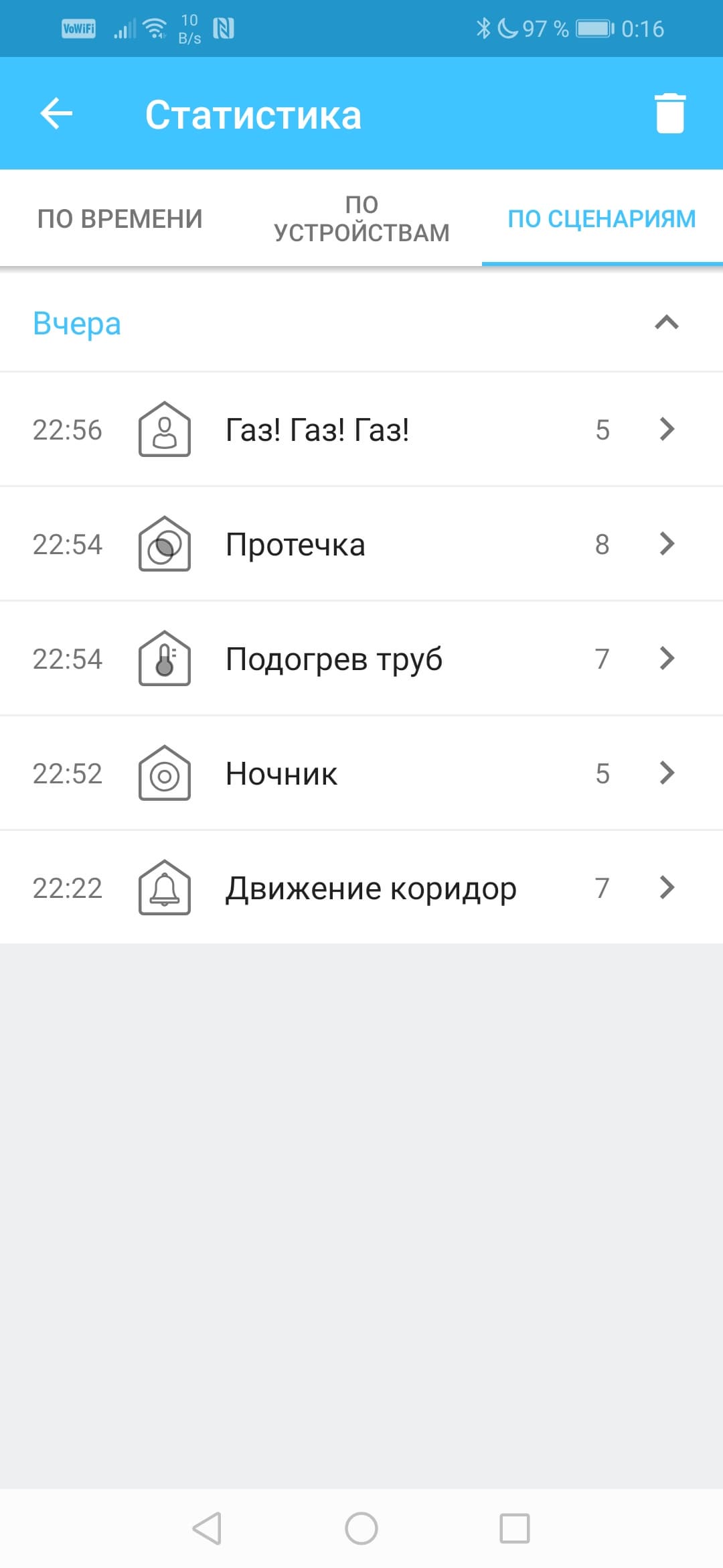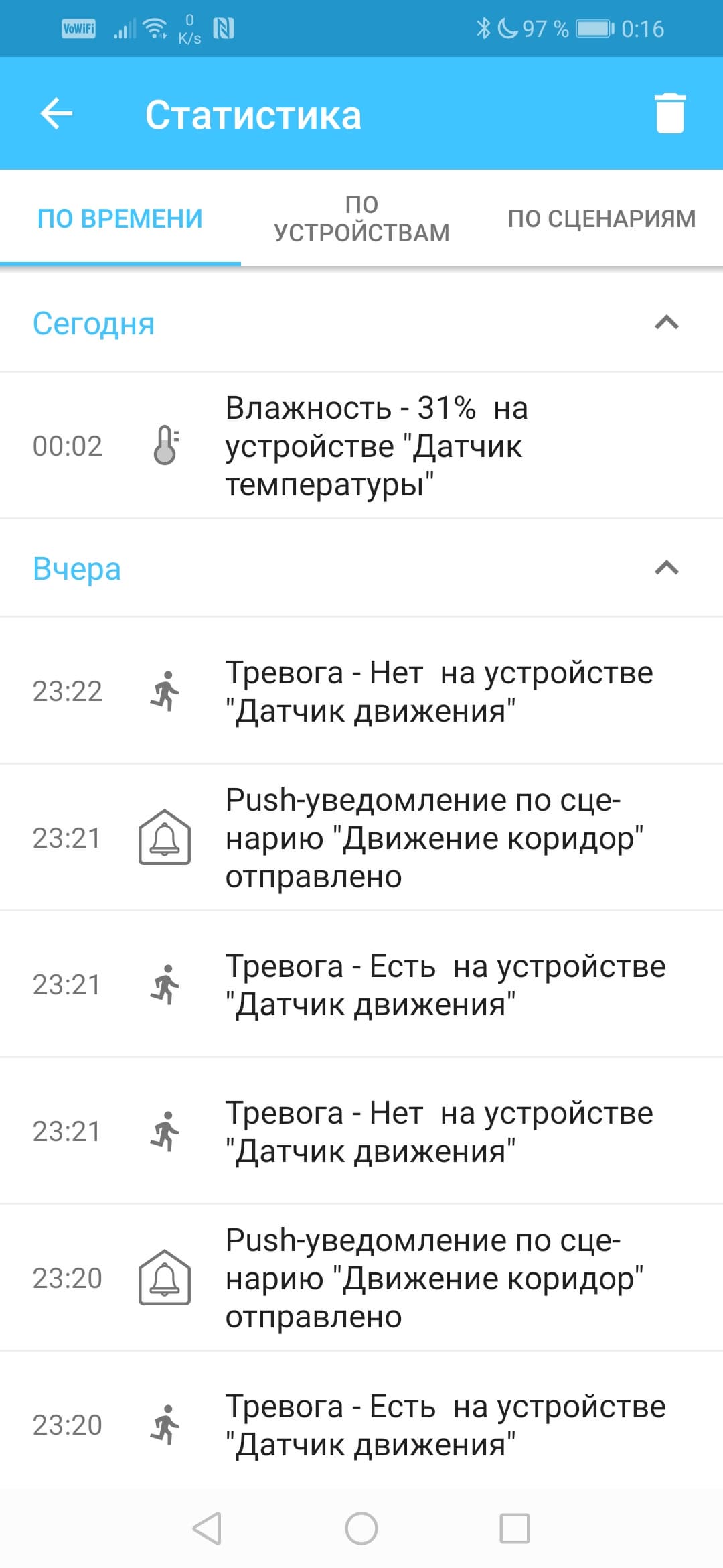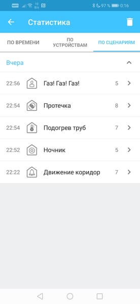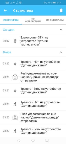Если по каким-то причинам пользователь пропустил push-уведомление, то он в любое время может изучить архив событий, который находится в разделе Статистика.