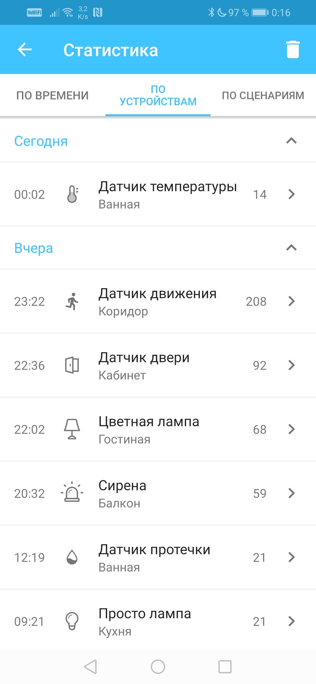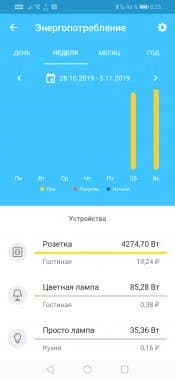 Еще одна архиполезнейшая функция скрывается в пункте Энергопотребление. Оказывается, умные лампы тщательно подсчитывают потребленную ими энергию, а умная розетка скрупулезно фиксирует весь прошедший через нее ток. А если пользователь не поленился внести сведения о стоимости электроэнергии, то рядом с потребленными ваттами будет отображена еще и их стоимость. Кстати, благодаря этой розетке автор осознал, насколько неэкономичен этот старый телевизор, один из первых жидкокристаллических, который подключен к розетке. Шутка ли, четыре киловатта за пару дней!