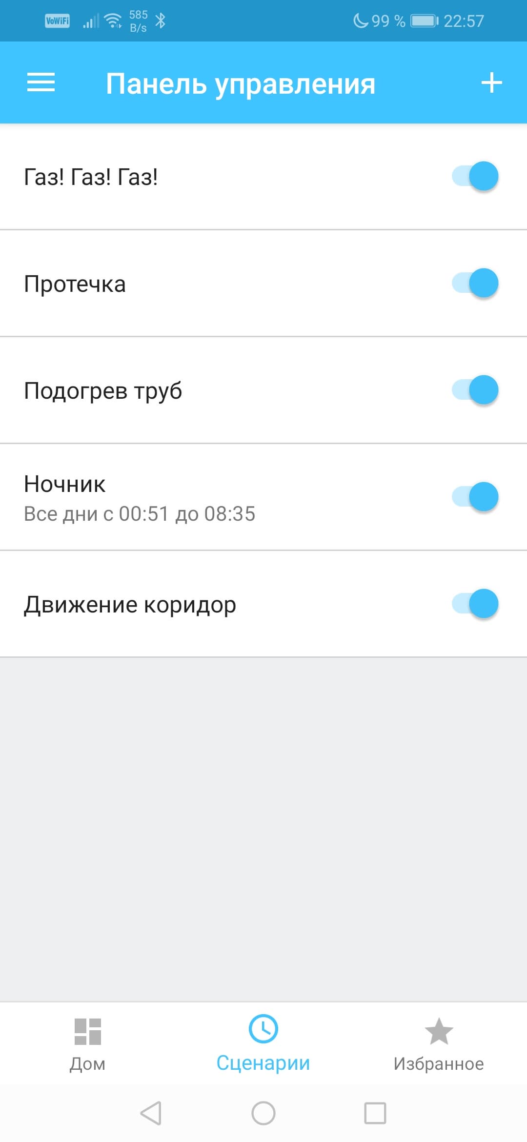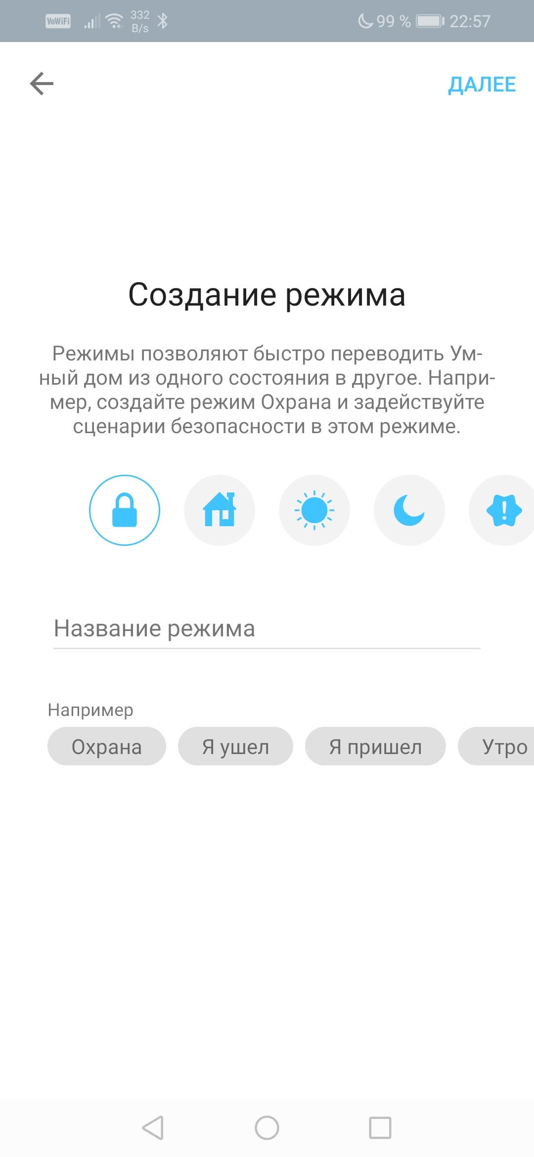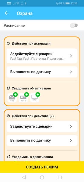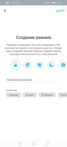 Назначение режимов легко объяснить. Режим — это набор сценариев, которые выполняются при задействовании режима. Например, при создании режима «Охрана» имеет смысл активировать лишь сценарии, контролирующие открытие дверей, движение, газ, воду и т. д. При этом сценарий с недвусмысленным названием «Ночник» совершенно необязательно выполнять.