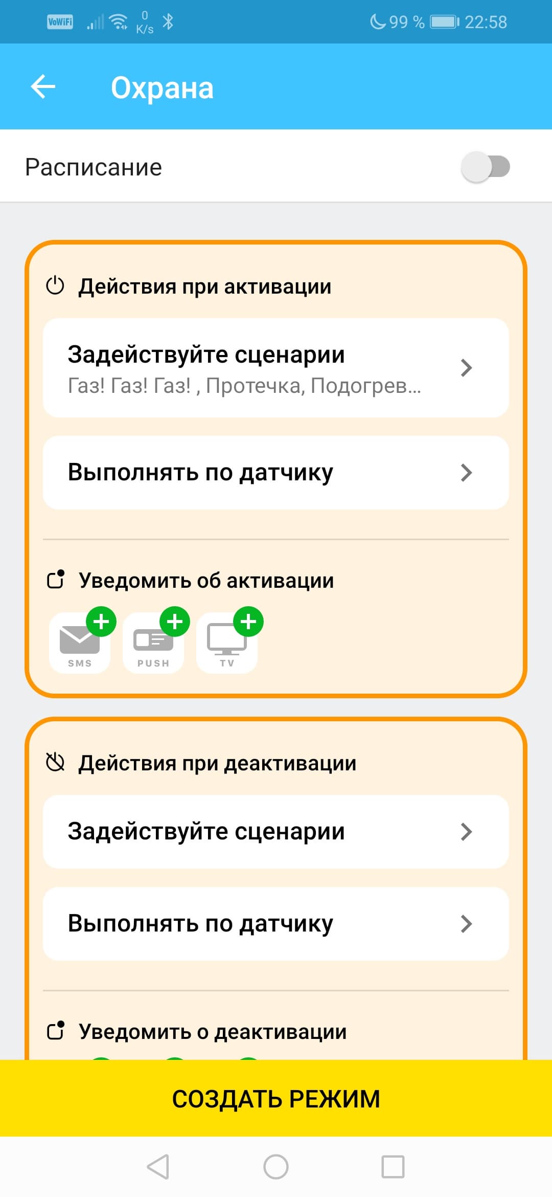 Созданный режим можно быстро задействовать, при этом включатся в работу даже те резервные сценарии, которые до этого были неактивны.