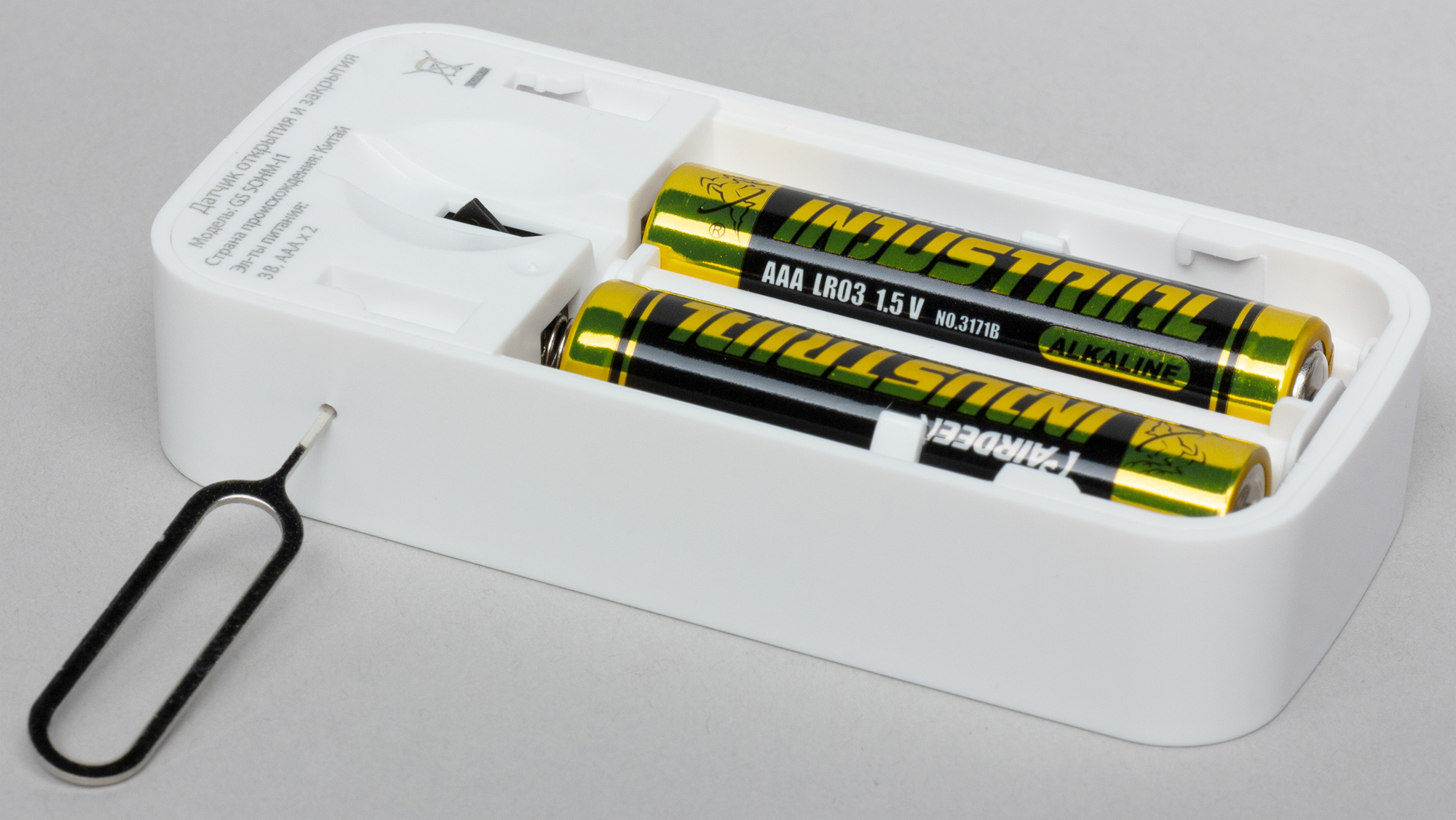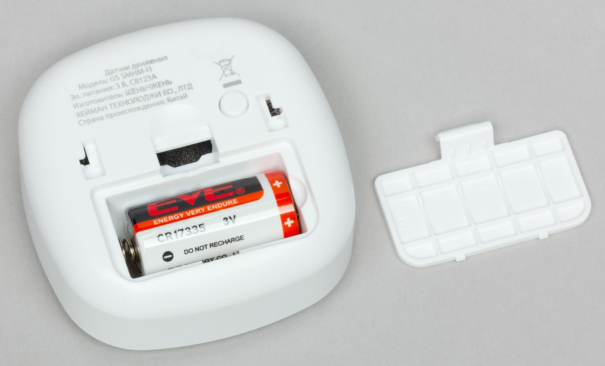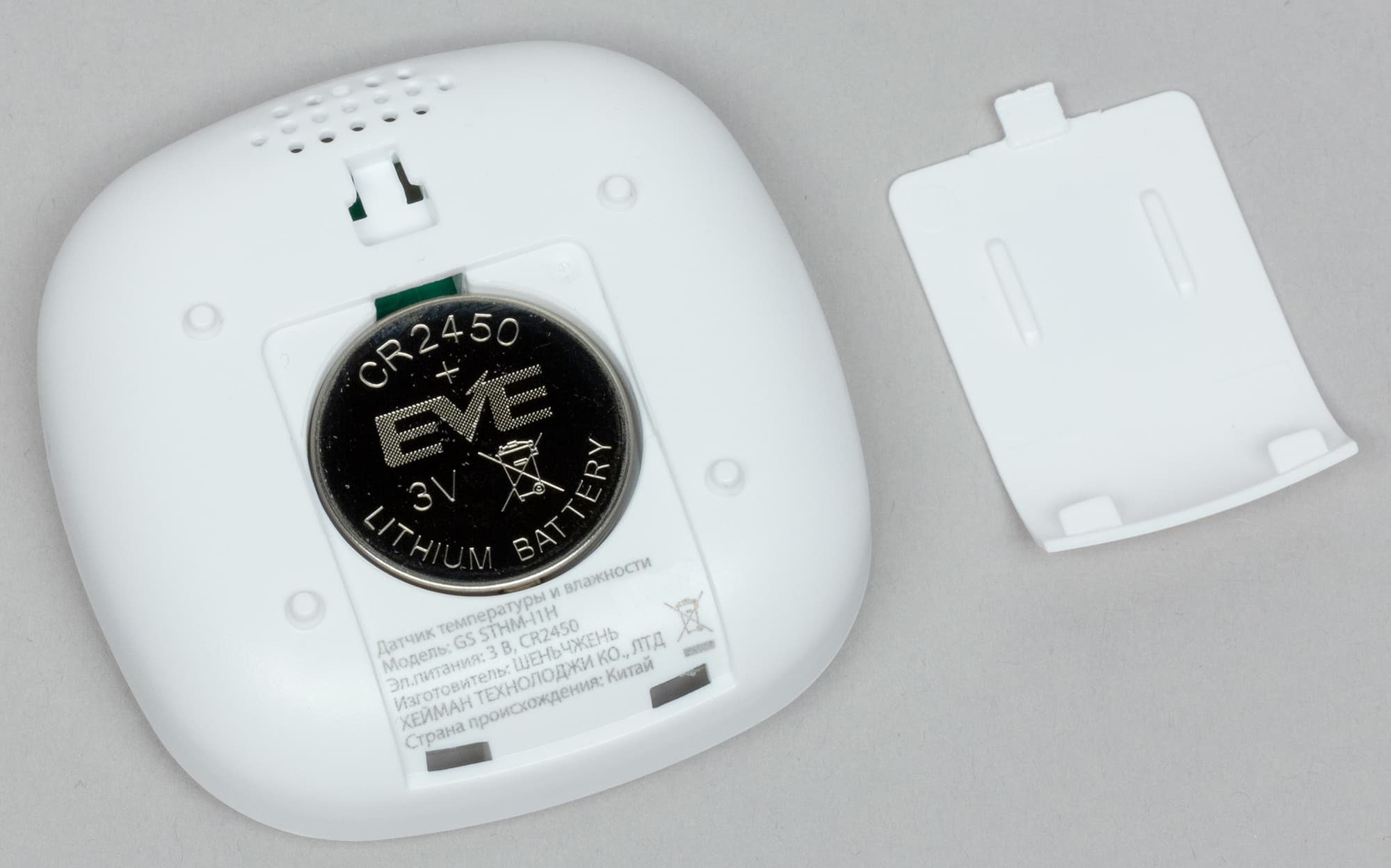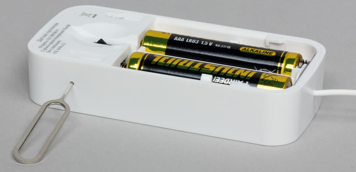 Крепежная площадка снабжена двусторонним скотчем, других способов крепления не предусмотрено. Соединение с главным управляющим устройством производится нажатием скрытой кнопки с помощью прилагаемой шпильки. Датчик получает питание от плоской батареи CR2450. Трудно сказать, каков будет срок ее использования, особенно при низких температурах, когда емкость элементов питания падает в разы. К слову, на тестирование датчик прибыл уже без защитной пленки в батарейном отсеке, а значит, датчик длительное время был в рабочем состоянии. В результате батарея оказалась разряженной и датчик не мог функционировать. Но стоило заменить батарейку — датчик ожил.