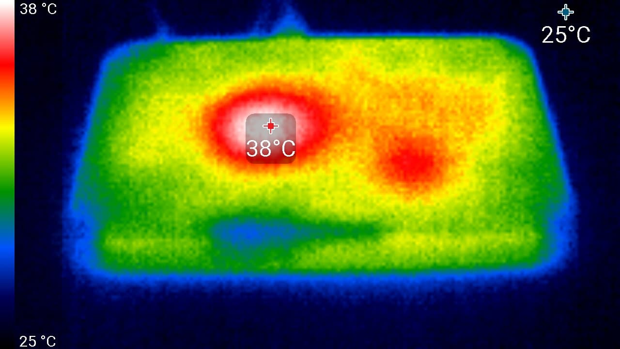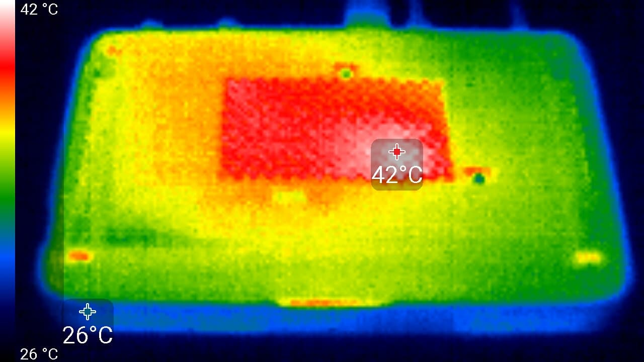 Однако наши измерения показали, что даже столь нагруженное устройство может иметь не горячее сердце. Следующие тепловизионные снимки сделаны после нескольких часов воспроизведения 4K-контента в помещении с температурой около 26 °C. Можно видеть, что корпус приемника в районе процессора нагрелся лишь до 42 °C, что совершенно неопасно для современной электроники.