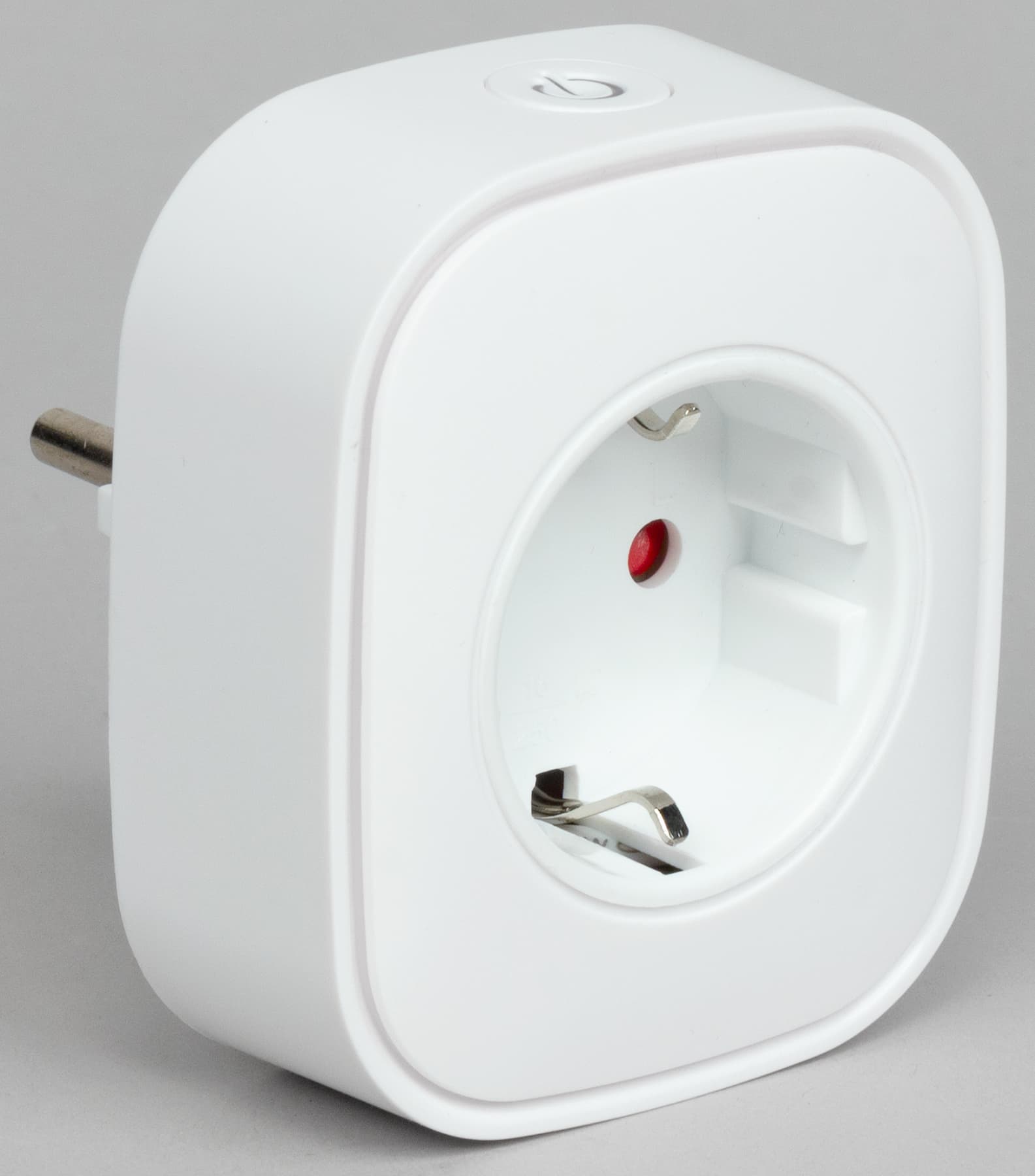 Единственная кнопка — она же индикатор работы — служит для подачи или прекращения питания, а также для подключения к модулю управления умного дома. Для перевода розетки в режим поиска базы нужно зажать эту кнопку и удерживать в нажатом состоянии в течение пяти секунд, пока индикатор не начнет мигать синим цветом.