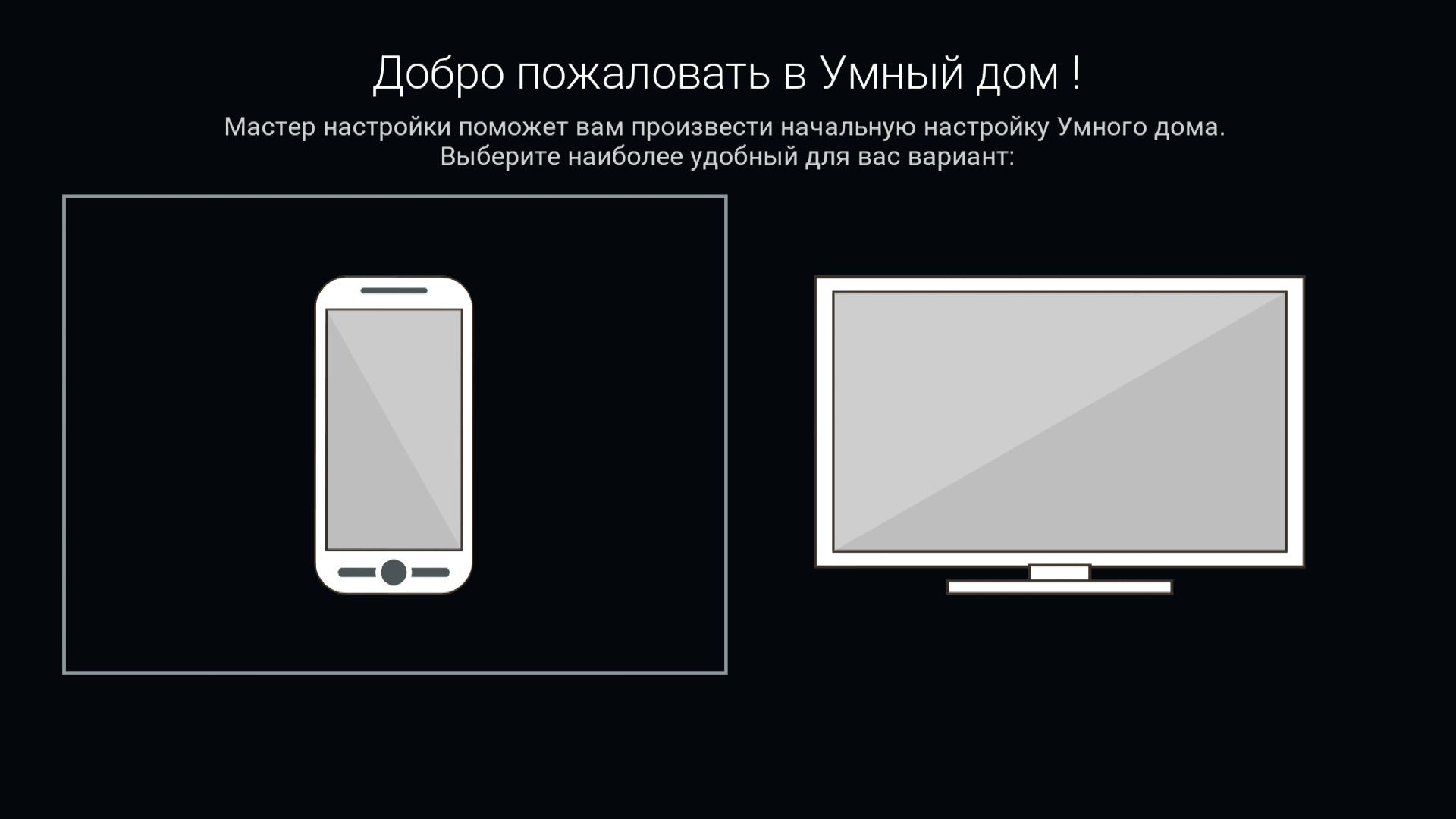 В этом случае на пульте ДУ следует нажать кнопку Меню и выбрать пункт Умный дом. После загрузки приложения на экране отобразится выбор способа подключения.