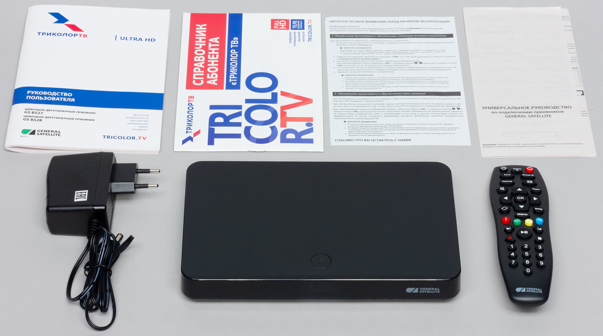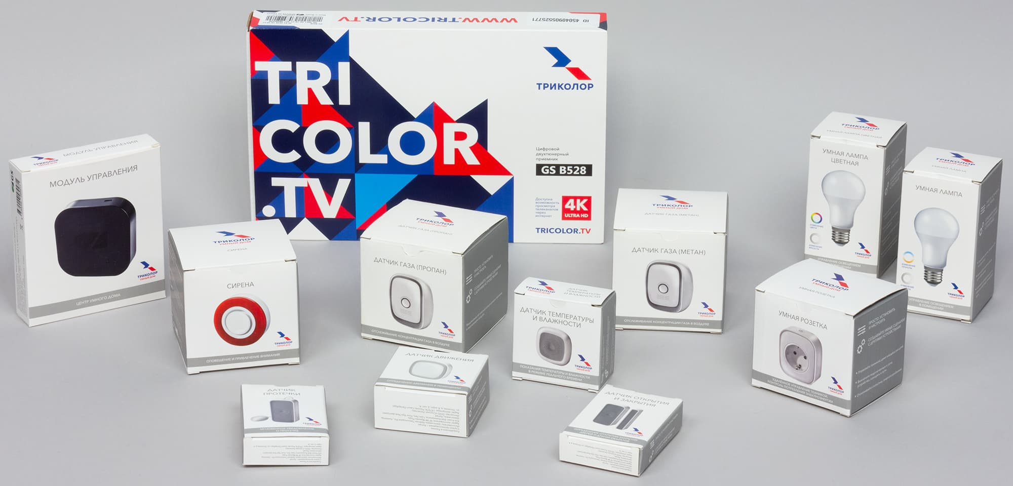 В набор, предоставленный для тестирования, вошел цифровой спутниковый двухтюнерный приемник модели GS B528, а также все имеющиеся сегодня у Триколора датчики и устройства: