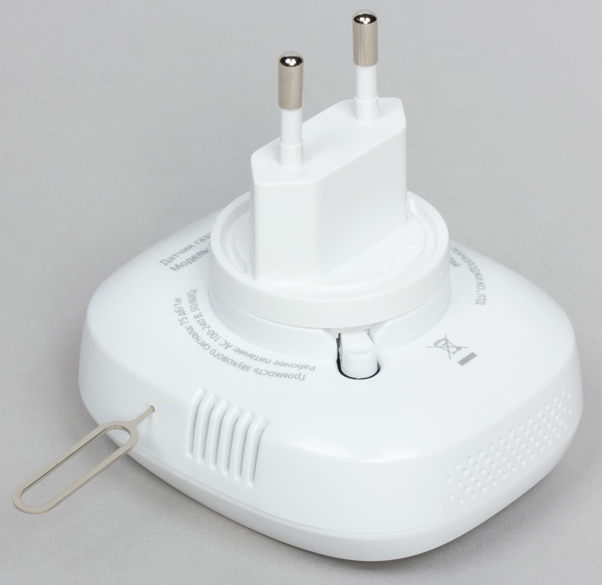 Помимо центральной тест-кнопки, в устройстве имеется еще одна, скрытая, предназначенная для соединения с центральным модулем. Ее нажатие производится с помощью прилагаемой шпильки.